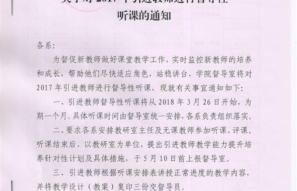 關(guān)于對2017年引進教師進行督導性聽課的通知
