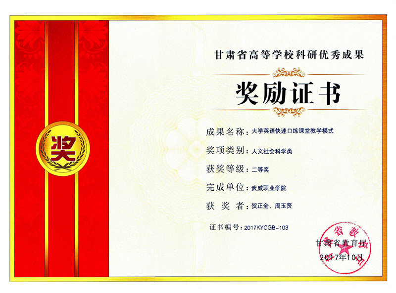 近日從學(xué)院科研處傳來(lái)喜訊,我系教師賀正全申報(bào)的《大學(xué)英語(yǔ)快速口練課堂教學(xué)模式》榮獲甘肅省教育廳頒發(fā)的2017年甘肅省高等學(xué)校科研優(yōu)秀成果二等獎(jiǎng)。這是我院自建院以來(lái)獲得的最高級(jí)別的高??蒲袃?yōu)秀成果獎(jiǎng)。本次獲得二等獎(jiǎng)的科研成果共有154項(xiàng),其中高職高專報(bào)送的科研成果只有9項(xiàng)獲得二等獎(jiǎng)。