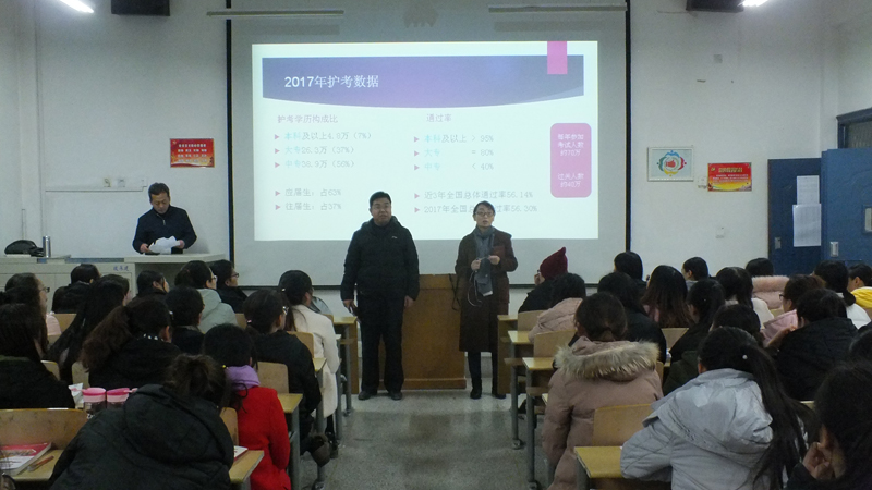 此次講座由去西安參加2018年護考師資培訓的牛子勁老師主講。牛老師分別從2017年護考成績數(shù)據(jù)分析、護考試題新特點,以及2018年護考命題的趨勢進行了詳細分析與說明,并且提出了應對策略。他希望2015級護考生準確把握護考形勢,確定應考學習計劃,結(jié)合護考要求加強專業(yè)課學習,在明年的護考中取得好成績。