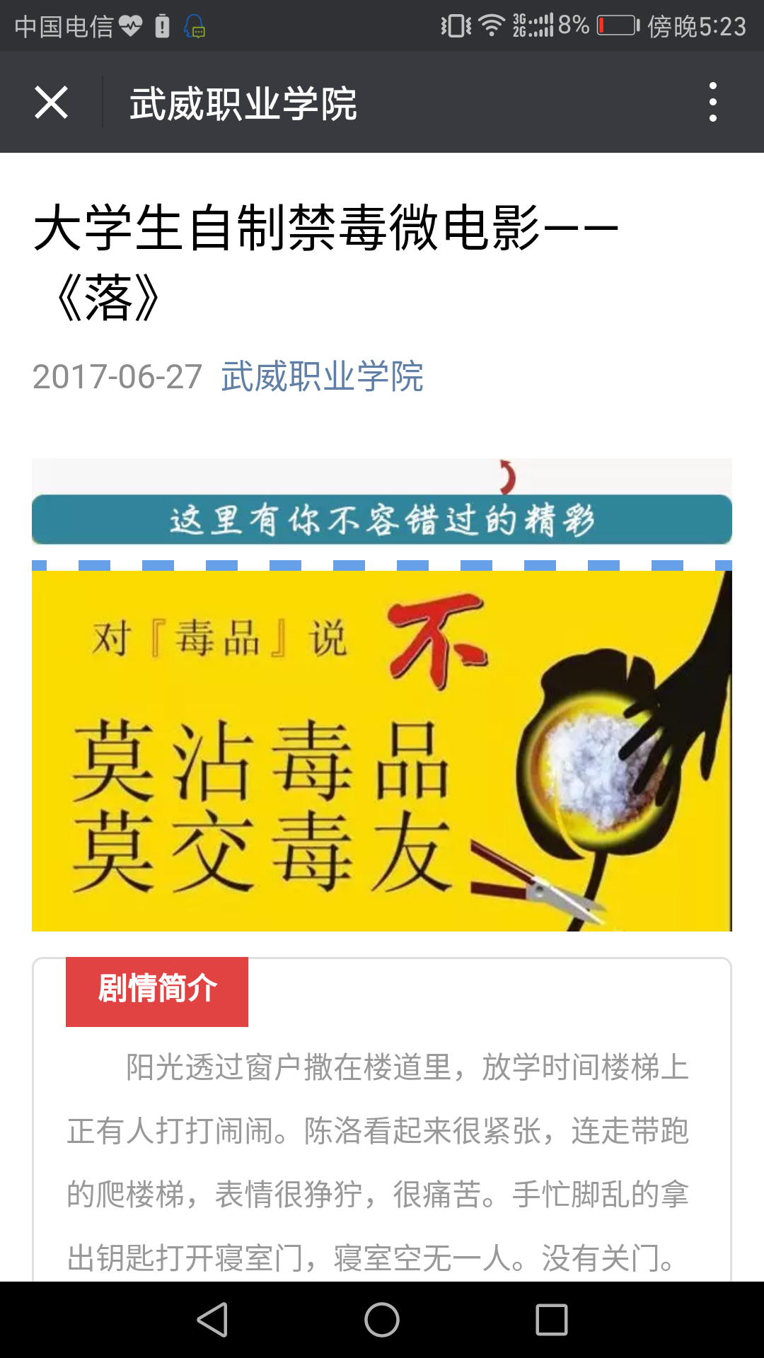 為進一步推進平安校園建設,不斷推進青少年毒品預防教育“6·27”工程活動的深入開展,增強師生的禁毒意識,武威職業(yè)學院根據(jù)甘肅省禁毒委員會辦公室、甘肅省教育廳《關于做好2017年秋季開學在校學生毒品預防教育工作的通知》要求,在全院范圍內開展了禁毒宣傳教育“五個一”活動。