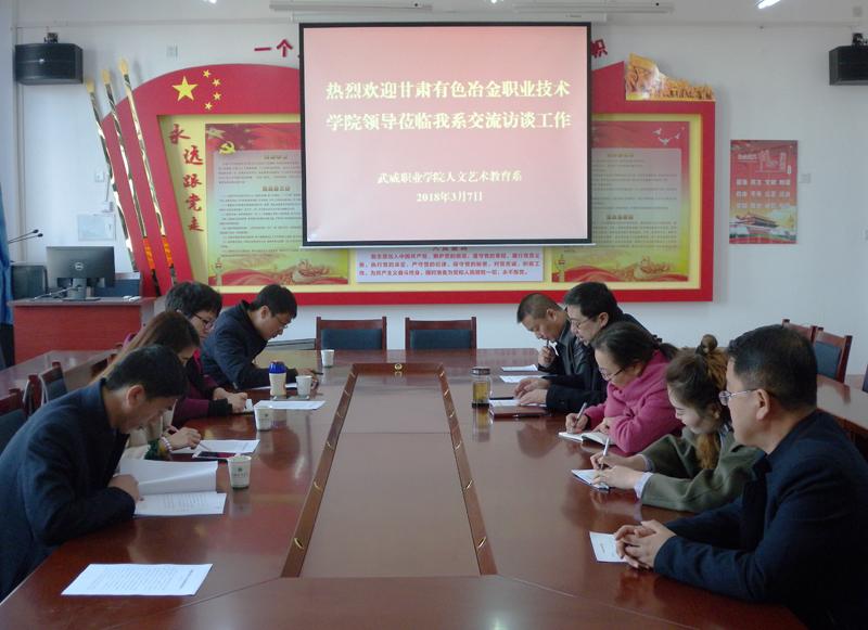 3月7日上午,甘肅有色冶金職業(yè)技術學院教育系負責人妙學春一行4人到我系進行交流學習,系黨總支書記胡靜峰、各教研室主任參加了會議。