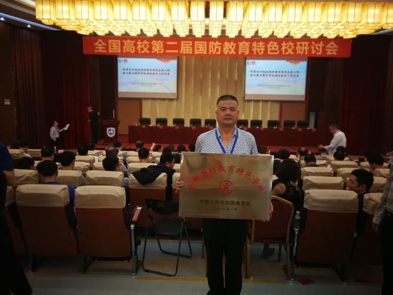 在會上,中國高等教育學(xué)會國防教育工作委員會組委會向?qū)W院頒發(fā)了“全國國防教育特色學(xué)?!迸?。