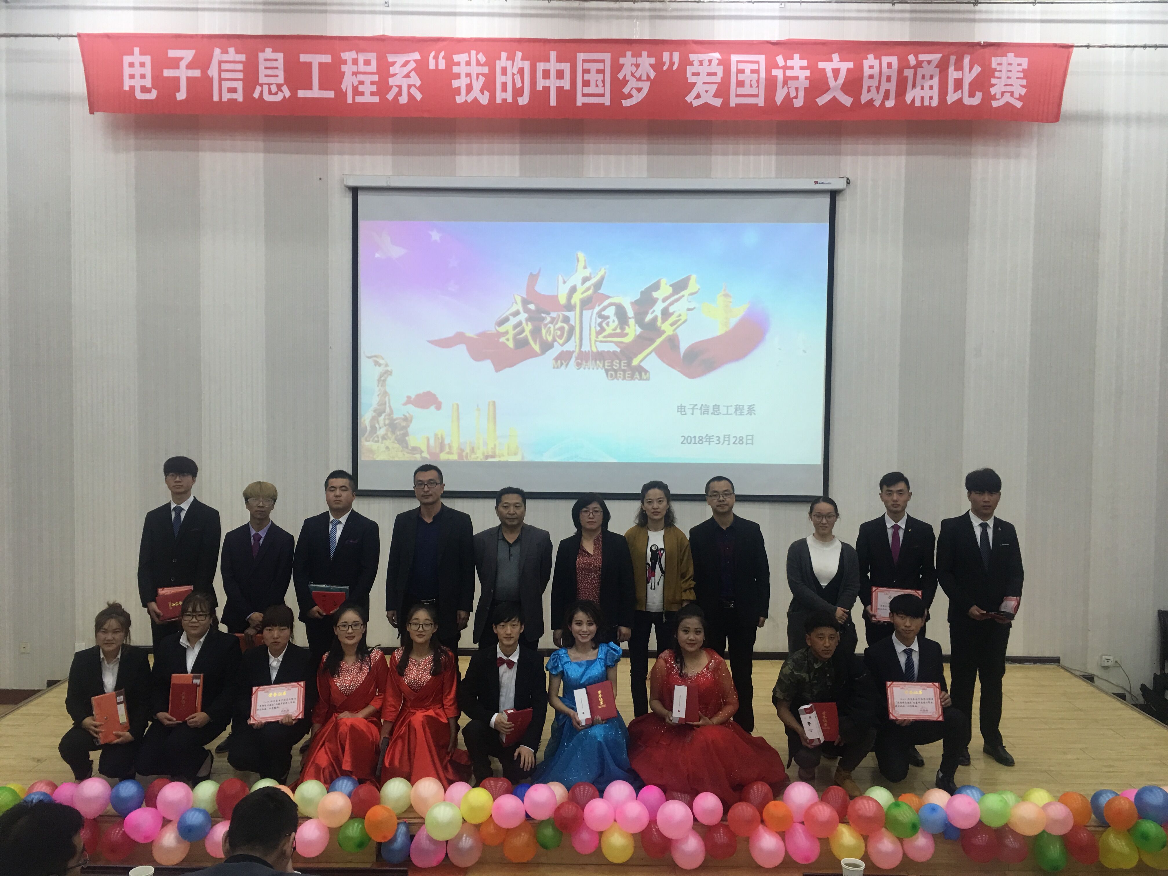 ? ? 為進(jìn)一步弘揚(yáng)和培育社會(huì)主義核心價(jià)值觀,引導(dǎo)學(xué)生實(shí)現(xiàn)國家富強(qiáng)、民族復(fù)興的偉大“中國夢”而發(fā)憤圖強(qiáng)、勇?lián)厝危?/span>激勵(lì)學(xué)生通過誦讀經(jīng)典來繼承傳統(tǒng),增強(qiáng)學(xué)生的愛國情感。3月28日,電子信息工程系在正德廳舉辦了“我的中國夢”愛國詩文朗誦比賽。電子信息工程系黨總支書記袁青年、系主任李亞梅、全體班主任及學(xué)生觀看了比賽。