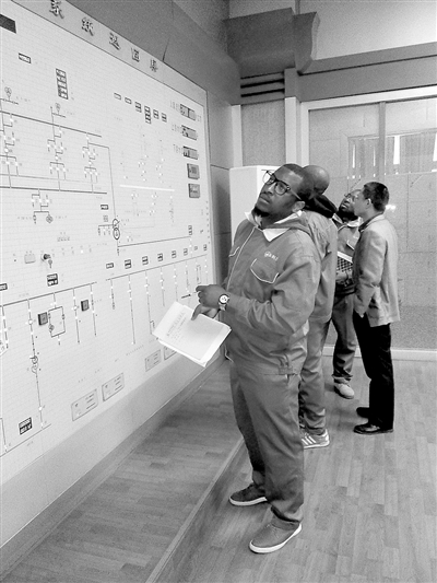 圖為該校2012級(jí)赤道幾內(nèi)亞留學(xué)生在故縣水利樞紐電站中控室進(jìn)行運(yùn)行實(shí)習(xí)。