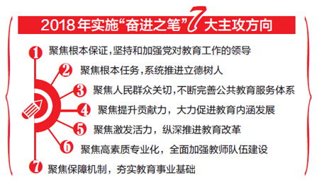 陳寶生指出,黨的十九大對教育工作作出了全面系統(tǒng)部署。在加快教育現(xiàn)代化、建設(shè)教育強(qiáng)國的新征程中,解決教育發(fā)展不平衡不充分的問題將是我們長期要面對的工作主題。要以問題為導(dǎo)向,將其作為實(shí)施“奮進(jìn)之筆”的著力點(diǎn)和主攻方向。一是聚焦根本保證,堅(jiān)持和加強(qiáng)黨對教育工作的領(lǐng)導(dǎo)。要把黨的政治建設(shè)擺在首位,狠抓大抓基層黨組織建設(shè),持之以恒正風(fēng)肅紀(jì),抓好意識(shí)形態(tài)工作。二是聚焦根本任務(wù),系統(tǒng)推進(jìn)立德樹人。要把德育擺在更加重要的位置,堅(jiān)定青少年理想信念,改進(jìn)和加強(qiáng)思想政治工作,大力發(fā)展素質(zhì)教育,加強(qiáng)語言文字工作。三是聚焦人民群眾關(guān)切,不斷完善公共教育服務(wù)體系。要促進(jìn)學(xué)前教育普惠健康發(fā)展,加快城鄉(xiāng)義務(wù)教育一體化發(fā)展步伐,加大普及高中階段教育攻堅(jiān)力度,加大對困難地區(qū)扶持力度,切實(shí)加強(qiáng)校園安全。四是聚焦提升貢獻(xiàn)力,大力促進(jìn)教育內(nèi)涵發(fā)展。要以質(zhì)量為本,持續(xù)推進(jìn)職業(yè)教育質(zhì)量提升,健全高等教育內(nèi)涵發(fā)展政策機(jī)制,辦好繼續(xù)教育。五是聚焦激發(fā)活力,縱深推進(jìn)教育改革。要深化“放管服”改革,實(shí)施考招改革“拓展深化”攻堅(jiān)行動(dòng),支持和規(guī)范社會(huì)力量興辦教育,堅(jiān)定不移以開放促改革。六是聚焦高素質(zhì)專業(yè)化,全面加強(qiáng)教師隊(duì)伍建設(shè)。實(shí)施教師隊(duì)伍“建設(shè)改革”攻堅(jiān)行動(dòng),健全師德師風(fēng)建設(shè)長效機(jī)制,完善教師管理制度,提升教師獲得感、幸福感和榮譽(yù)感。七是聚焦保障機(jī)制,夯實(shí)教育事業(yè)基礎(chǔ)。要落實(shí)教育投入責(zé)任,加快教育信息化步伐,全力推進(jìn)依法治教。