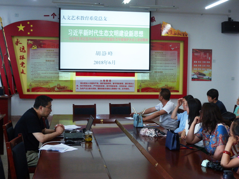 為深入學(xué)習(xí)習(xí)近平新時代中國特色社會主義思想,人文藝術(shù)教育系黨總支于6月13日下午在勵勤樓209黨員活動室開展書記講黨課活動。黨課由系黨總支書記胡靜峰主講,題目為《習(xí)近平新時代生態(tài)文明建設(shè)新思想》,系全體黨員參加了此次活動。