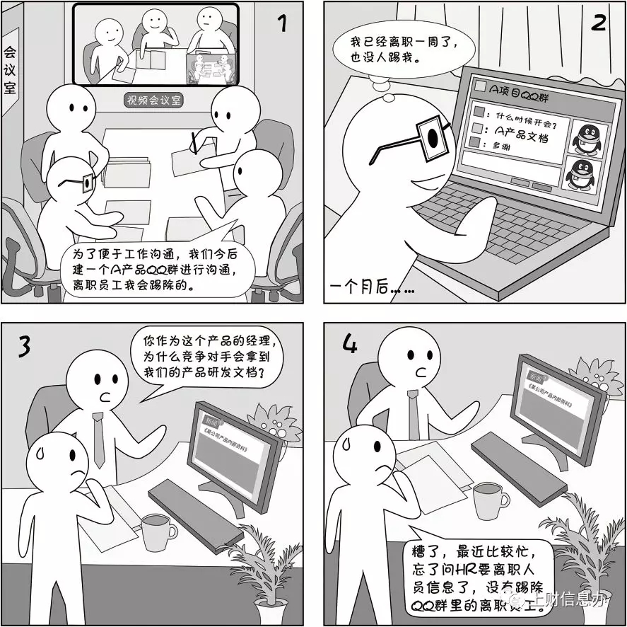 2 公共即時(shí)通訊平臺(tái)上的聊天群(如微信、QQ)中,管理員要嚴(yán)格審核加群人員,并及時(shí)踢出離職或離開(kāi)項(xiàng)目組人員。