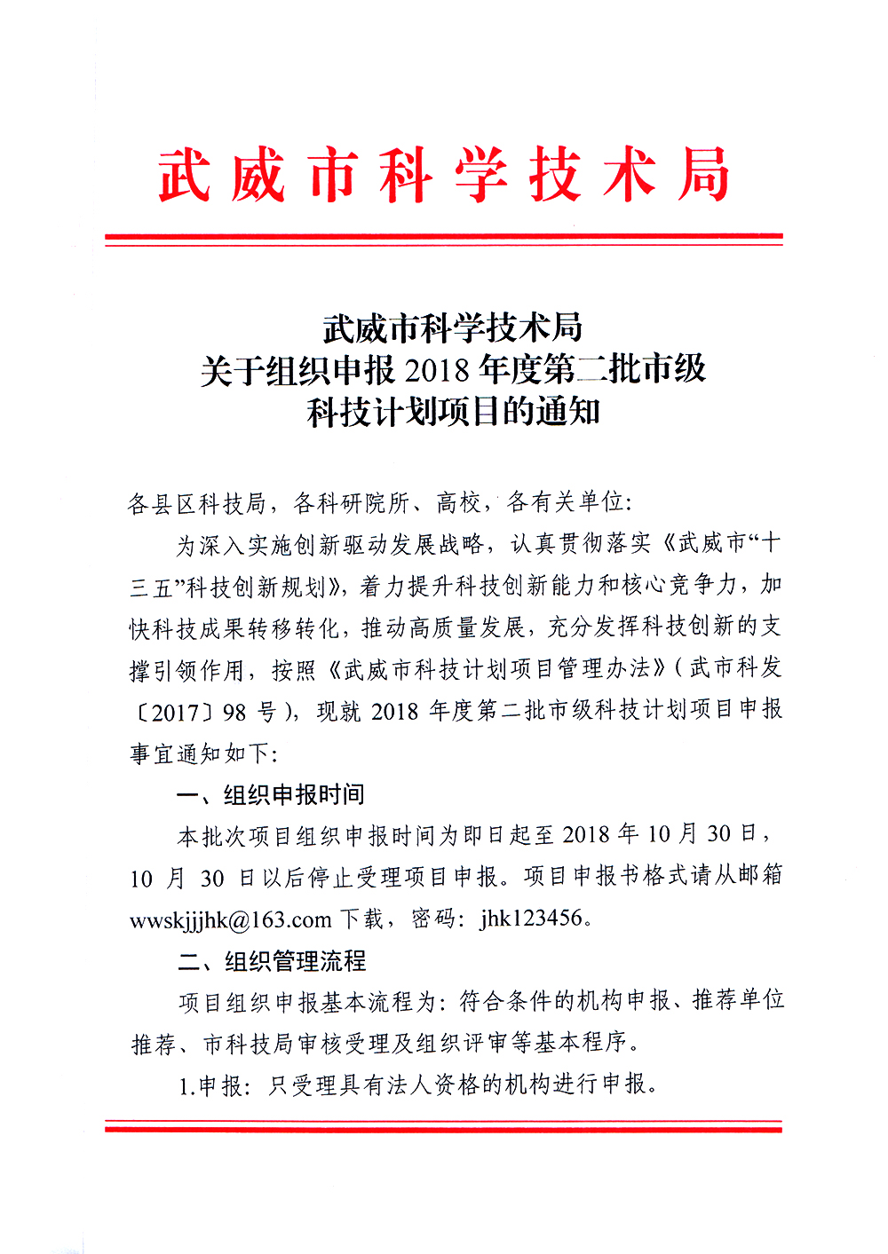 轉(zhuǎn)發(fā)武威市科學(xué)技術(shù)局關(guān)于組織申報(bào)2018年度第二批科技計(jì)劃項(xiàng)目的通知