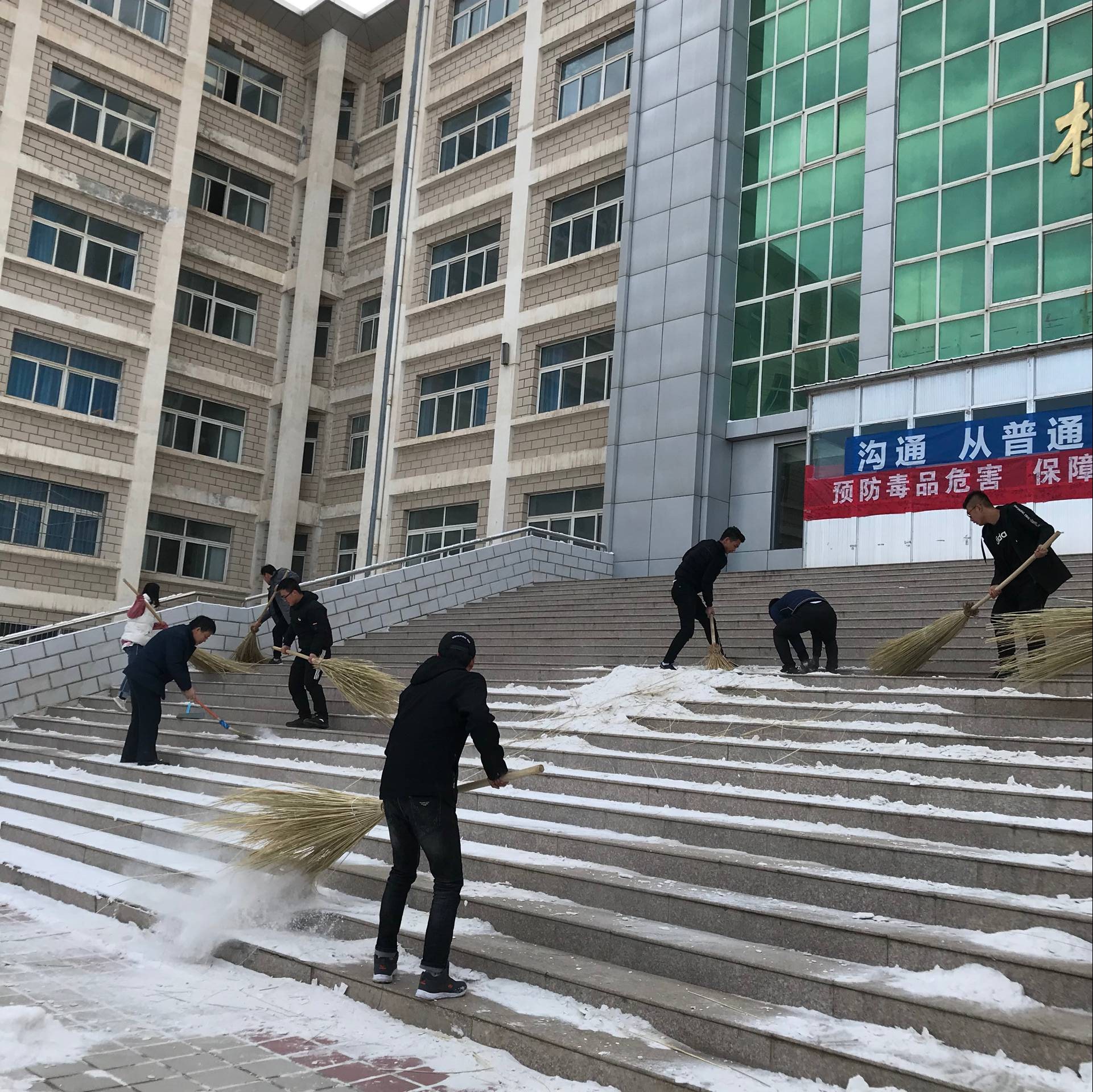 此次活動在博學(xué)樓前開展,10多名黨員及入黨積極分子參加此次活動。大家?guī)е鴴咧?、簸箕等清掃工具,在利用課間操的時間將行人走道及樓梯的落雪全部清掃干凈,為校園師生提供了良好的行走安全、衛(wèi)生環(huán)境。