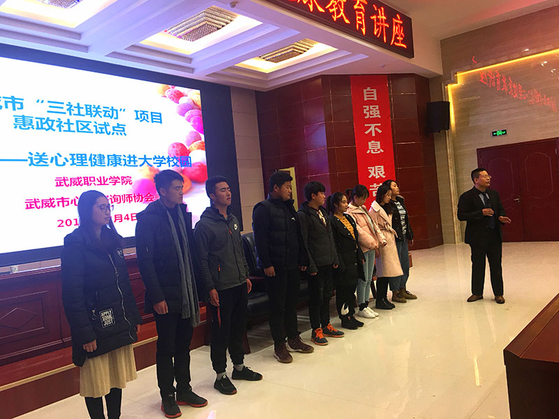 12月4日晚上,學(xué)生工作處聯(lián)合武威市“三社聯(lián)動(dòng)”惠政社區(qū)試點(diǎn)項(xiàng)目在學(xué)院菁英廳舉辦了心理健康專題講座暨心理信息員培訓(xùn)。此次講座邀請武威市心理咨詢師協(xié)會會長何飛老師主講,學(xué)院各系輔導(dǎo)員、2017級、2018級班級心理信息員、心翼心理社團(tuán)會員等220多人聆聽了講座。學(xué)生工作處處長王守云主持活動(dòng)。