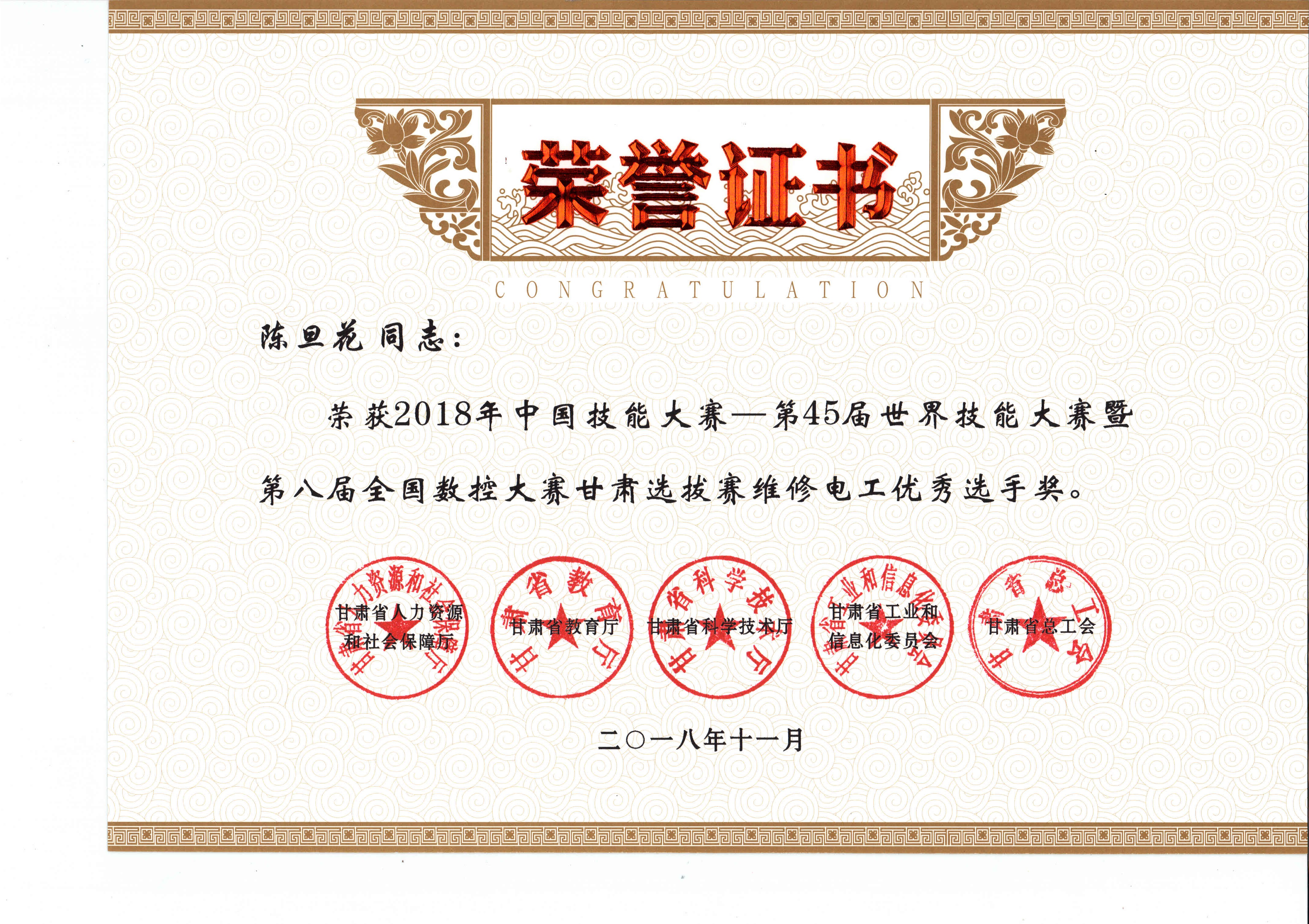 2018年中國(guó)技能大賽--第45屆世界技能大賽暨第八屆全國(guó)數(shù)控大賽甘肅選拔賽(維修電工項(xiàng)目)獲獎(jiǎng)證書