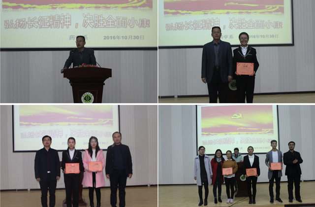 為紀念紅軍長征勝利80周年,激發(fā)師生弘揚偉大的長征精神,同時為豐富校園文化生活,展示青春正能量,藥學系團總支依據(jù)院團委的通知精神和系團學工作委員會關(guān)于增加學生課余活動的會議要求,于10月30日在正德廳組織開展了“傳承長征精神,筑我青春夢想”主題演講比賽。藥學系主任魏潤明出席了本次活動,各班班主任擔任本次比賽評委,2016級全體學生和2015級各班學生代表觀看了比賽。