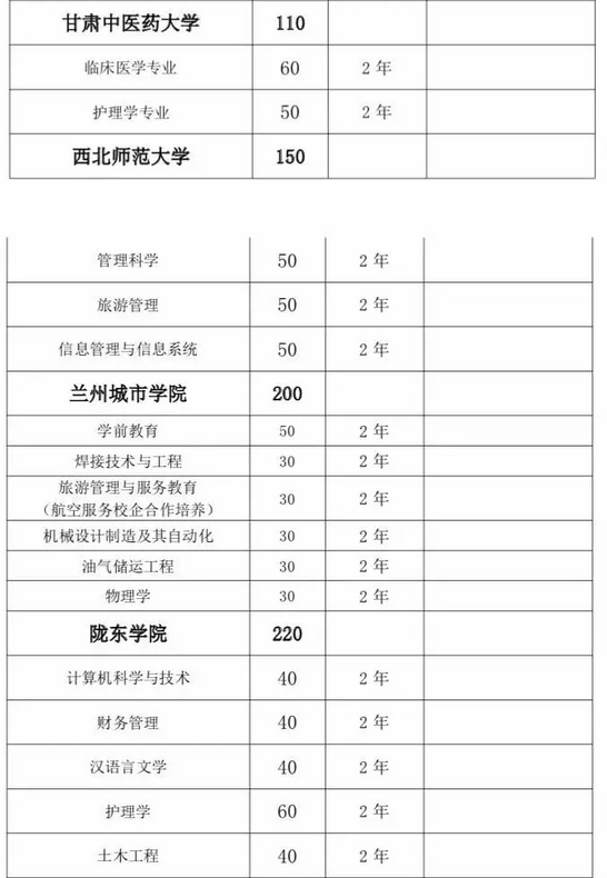 甘肅省2019年普通高?!皩I尽闭猩?jì)劃匯總表