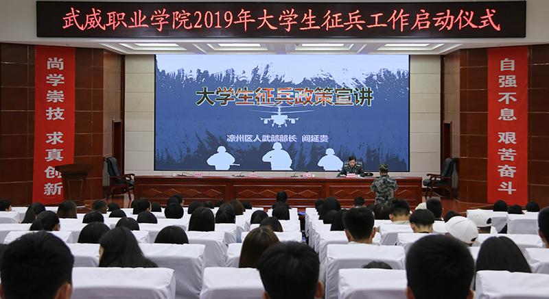 5月9日下午,學(xué)院2019年大學(xué)生征兵工作啟動(dòng)儀式在大學(xué)生活動(dòng)中心菁英廳舉行。武威軍分區(qū)司令員、市征兵領(lǐng)導(dǎo)小組副組長張國輝大校,涼州區(qū)人武部部長、涼州區(qū)征兵領(lǐng)導(dǎo)小組副組長兼征兵辦公室主任闞延貴上校,學(xué)院黨委書記、院長趙明,副院長田迎春,武威軍分區(qū)動(dòng)員處、涼州區(qū)人武部干部,學(xué)院各系黨總支書記、輔導(dǎo)員及學(xué)生代表共計(jì)220余人參加了會(huì)議。會(huì)議由田迎春主持。
