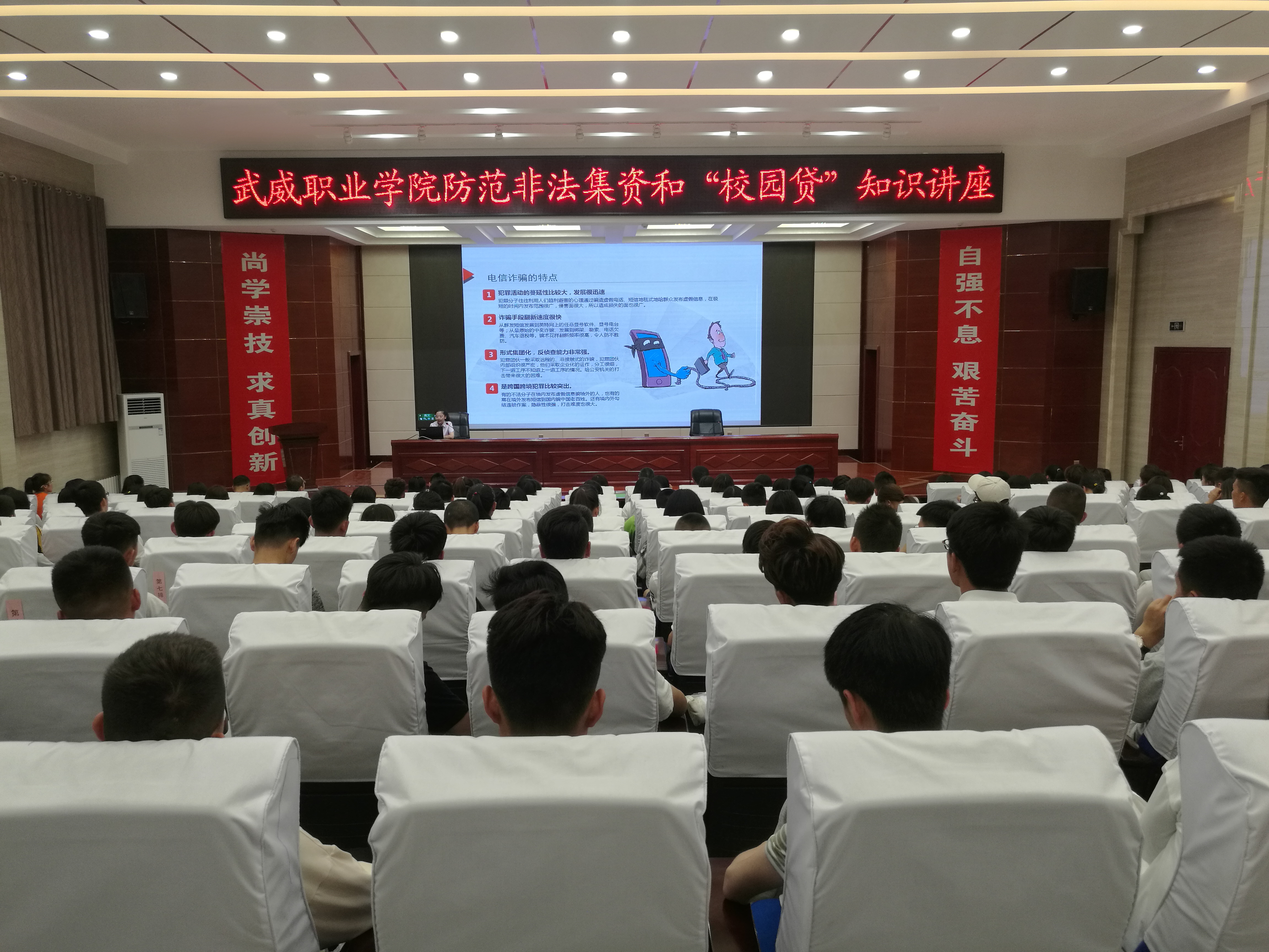 為深入貫徹落實甘肅省2019年防范非法集資和金融領域掃黑除惡宣傳月活動的有關精神,保護廣大師生的合法權益。6月9日晚,學院邀請中國農(nóng)業(yè)銀行武威支行風險管理部工作人員朱琳在菁英廳作了關于防范非法集資和校園貸知識講座,學院副院長王永緒出席活動,保衛(wèi)處、計劃財務處負責同志及各系師生代表200余人聆聽了講座。