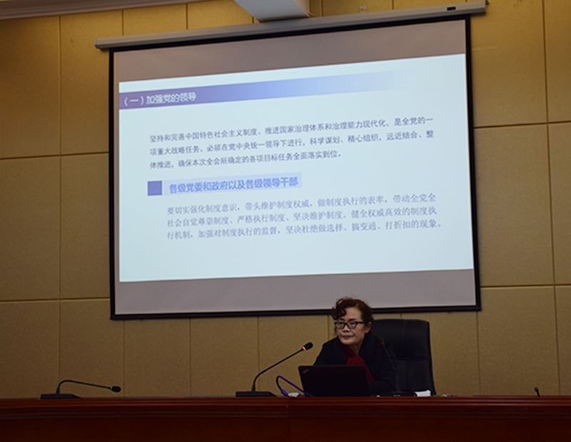 晏素珍以《中共中央關(guān)于堅持和完善中國特色社會主義制度推進(jìn)國家治理體系和治理能力現(xiàn)代化若干重大問題的決定》的學(xué)習(xí)與解讀為題,重點(diǎn)就全會召開的背景、意義和看點(diǎn);《決定》的基本框架和主要內(nèi)容以及抓好全會的學(xué)習(xí)貫徹的具體要求進(jìn)行了宣講。要求廣大師生提高政治站位,樹牢“四個意識”,堅定“四個自信”,做到“兩個維護(hù)”,推動全會精神在全系落地生根、取得扎實成效。為實現(xiàn)“兩個一百年”奮斗目標(biāo),實現(xiàn)中華民族偉大復(fù)興的中國夢而努力奮斗。