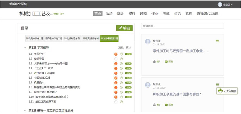 一是聯(lián)系學生,為加強教學過程班主任與任課教師之間溝通、應對教學過程突發(fā)情況,機械系要求所有班主任為各班建設(shè)了釘釘教學專用群,并按照班級課表邀請任課教師加入教學群確保在線教學順利實施。