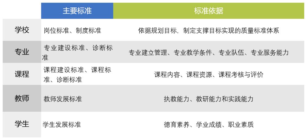 標準制定要體現多元質量觀,采用剛性與柔性相結合的辦法,解決特色發(fā)展與創(chuàng)新發(fā)展的問題,堅持“目標導向與問題導向”的統(tǒng)一。從實際出發(fā),查找問題、研究問題、解決問題,重點解決學校內部治理中存在的“透明管理”等突出問題;從專業(yè)建立管理、專業(yè)教學條件、專業(yè)隊伍、專業(yè)服務能力等維度制定專業(yè)建設標準和診斷標準;從課程內容、課程資源、課程考核與評價等維度制定課程建設標準、課程標準和課程診斷標準;教師發(fā)展標準要以提升教師的執(zhí)教能力、教研能力和實踐能力為要素;學生發(fā)展標準要重點考慮學生的德育素養(yǎng)、學業(yè)成績、職業(yè)素質。通過標準體系的打造,形成學校內部質量保證體系的標準鏈。