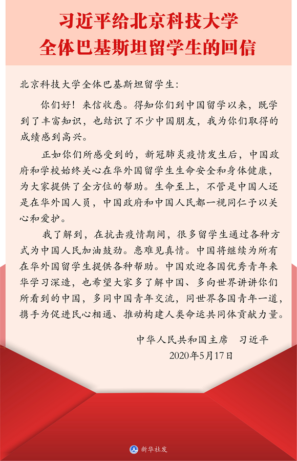 - 下一篇:習近平給北京科技大學全體巴基斯坦留學生的回信引發(fā)學院留學生熱烈反響[ 05-25 ]