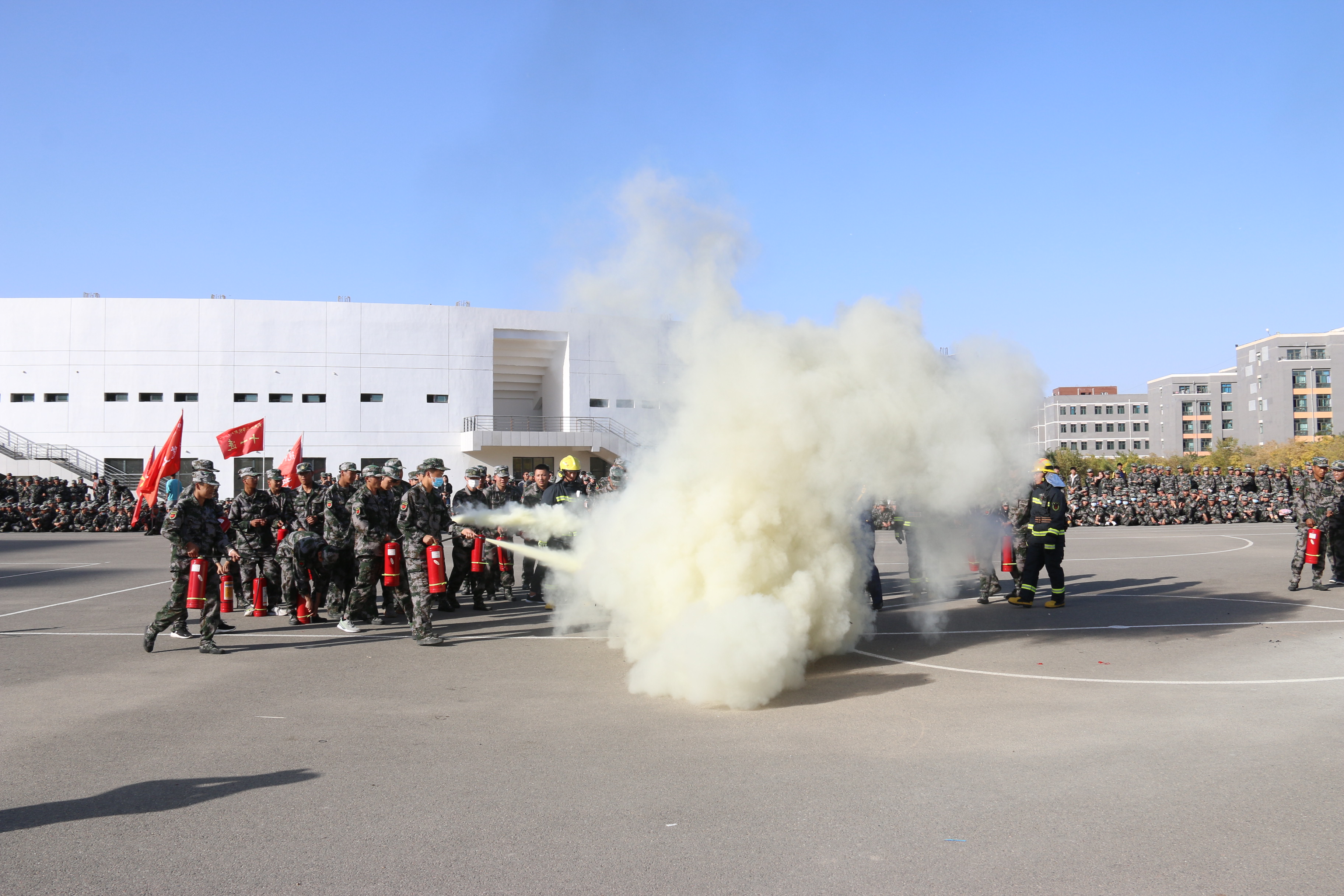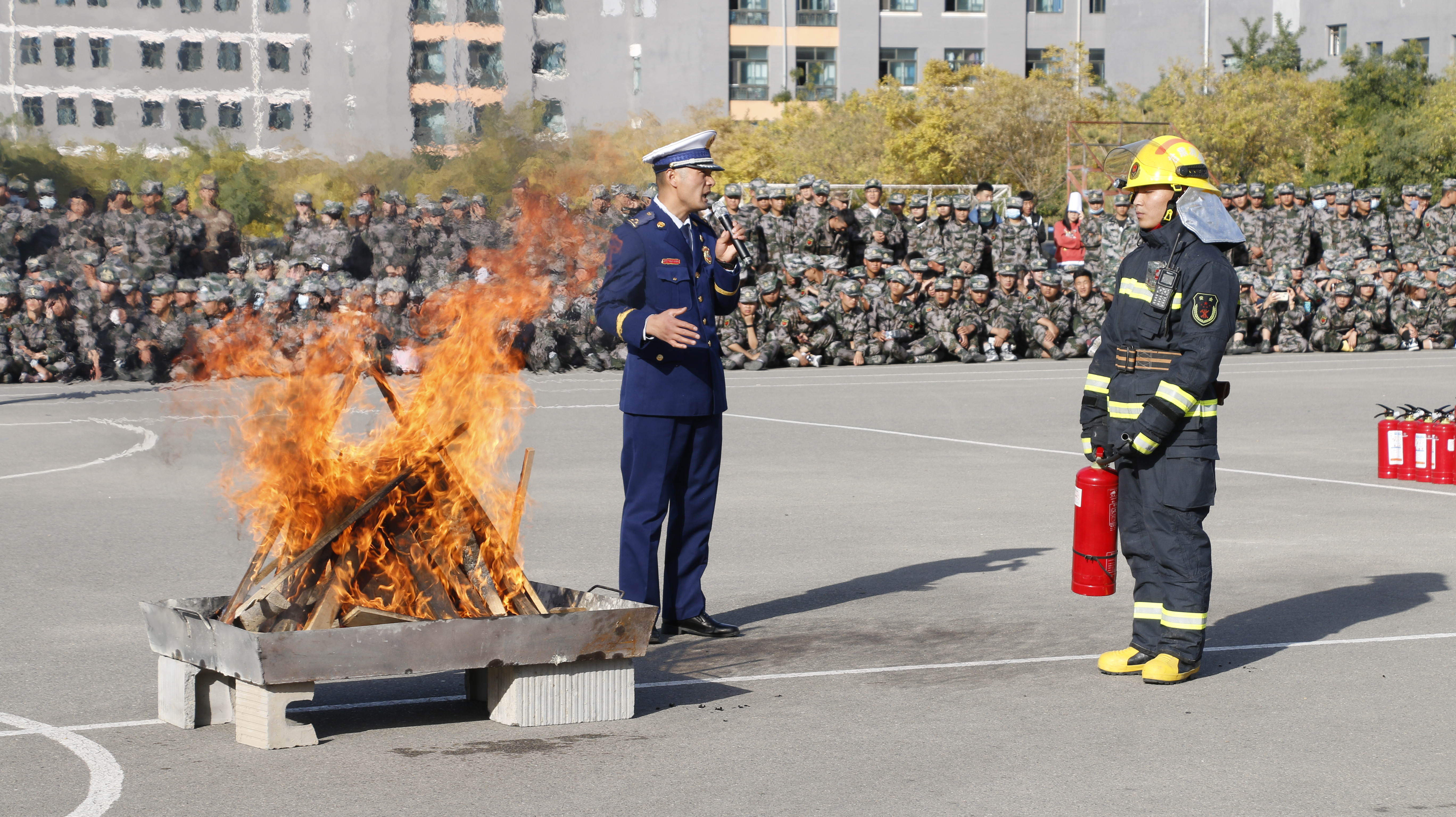 隨后,2020級全體新生整隊到操場參加了滅火演練。在消防救援中隊指戰(zhàn)員的講解和示范下,同學(xué)們學(xué)習(xí)了應(yīng)急逃生、火災(zāi)報警和滅火器使用等消防安全常識,學(xué)生代表體驗(yàn)了處置液化氣瓶滅火、油鍋滅火、干粉滅火器滅火等操作,在實(shí)戰(zhàn)中提高了消防應(yīng)急能力。