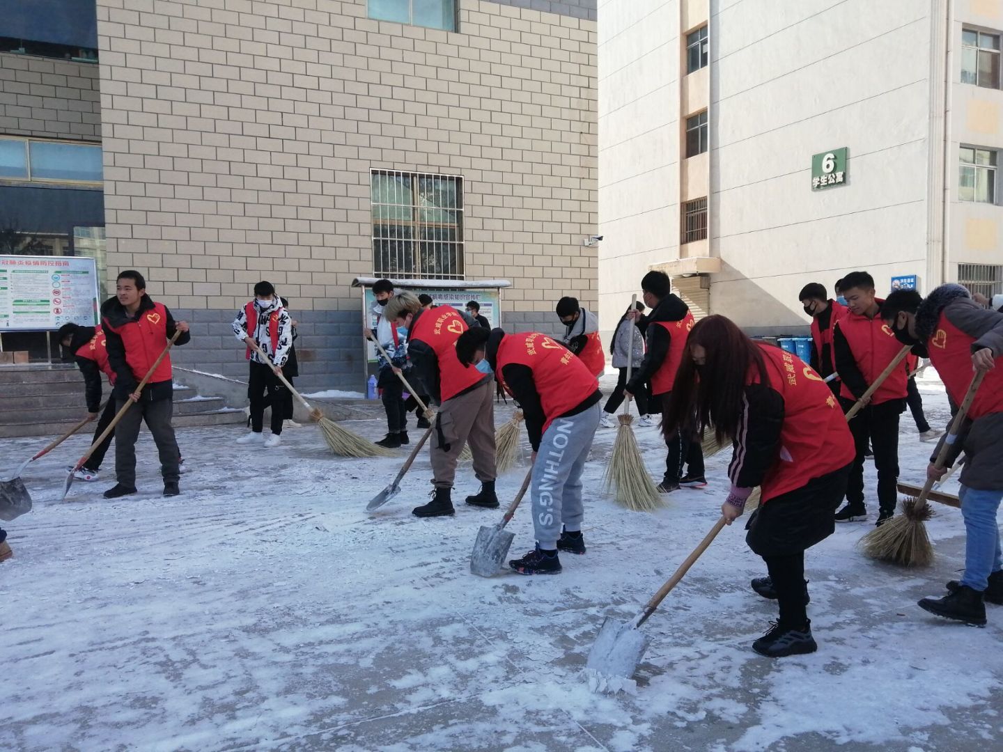 本次鏟雪的區(qū)域是教學(xué)樓區(qū)域的主干道和食堂門前道路。寒冷的天氣擋不住大家的勞動熱情,厚厚的冰塊蓋不住大家的志愿精神。鐵鍬聲此起彼伏,大家分工明確,相互合作,現(xiàn)場氣氛熱烈。經(jīng)過多小時(shí)的勞動,大家將教學(xué)樓前主干道積雪基本清掃干凈。