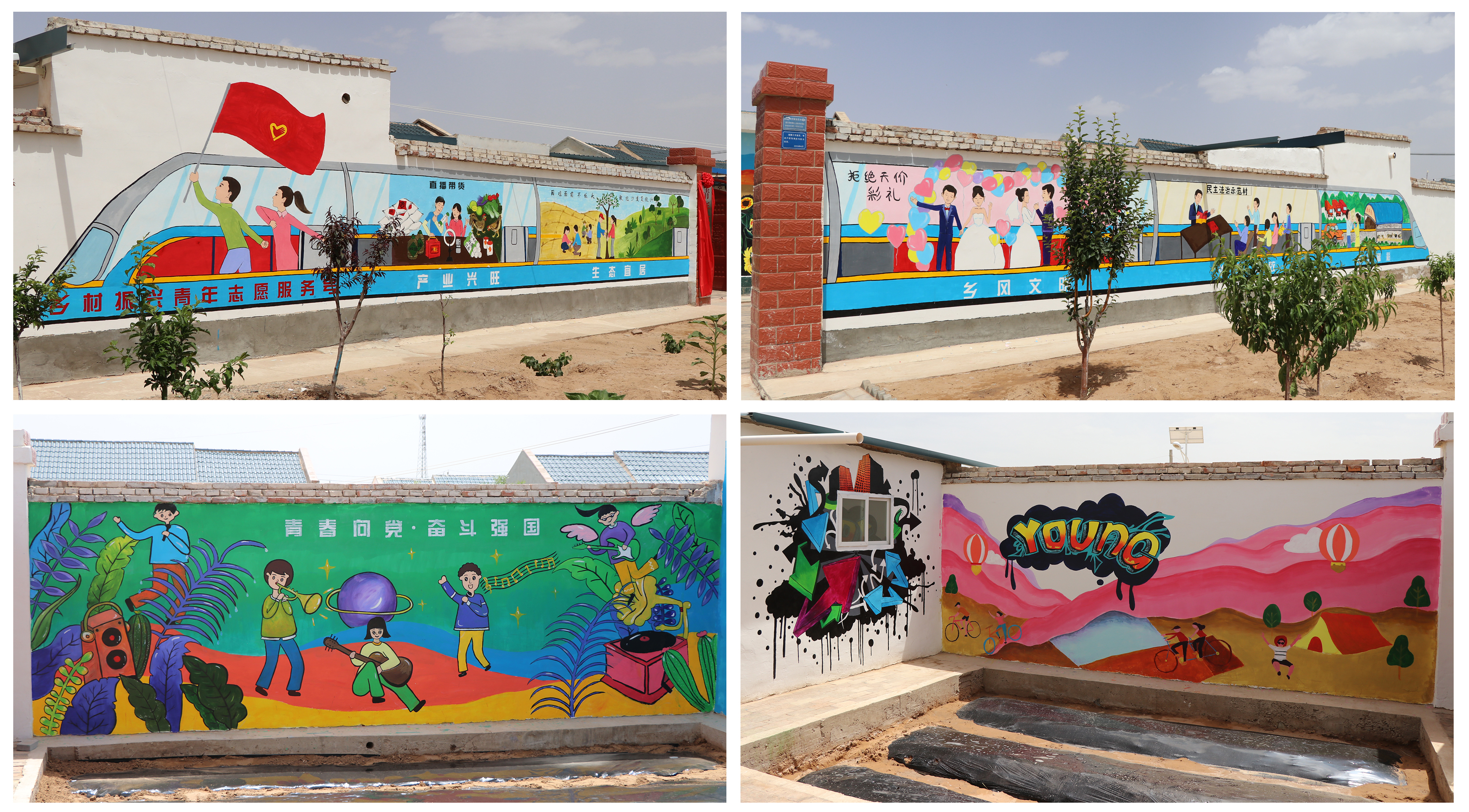 學院團委結合鄉(xiāng)村振興戰(zhàn)略和青年志愿服務工作特點對基地內(nèi)外墻體進行了彩繪設計,并組織人文藝術教育系師生完成了手工繪制。外墻以鄉(xiāng)村振興青年志愿服務號高速列車為主題,融入了鄉(xiāng)村振興戰(zhàn)略20字方針,產(chǎn)業(yè)興旺、生態(tài)宜居、鄉(xiāng)風文明、治理有效、生活富裕5個方面的總體目標。內(nèi)墻以青春時尚為主題,利用涂鴉的形式,展現(xiàn)青年人朝氣蓬勃、積極向上,青春向黨、奮斗強國的精神風貌。