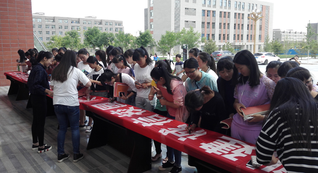 6月14日是第九個(gè)全國“信用記錄關(guān)愛日”。為進(jìn)一步加強(qiáng)我院學(xué)生的誠信教育,結(jié)合當(dāng)前學(xué)院正在進(jìn)行的社會(huì)信用體系建設(shè)及國家助學(xué)貸款工作,當(dāng)日中午12時(shí),學(xué)生工作處在大學(xué)生活動(dòng)中心廣場(chǎng)發(fā)起“創(chuàng)建誠信校園 樹立誠信學(xué)風(fēng) 做誠信學(xué)子”的主題簽名倡議活動(dòng)。200多名學(xué)生頂著炎炎烈日前來參加簽名活動(dòng),并在橫幅上鄭重簽下了自己的名字。