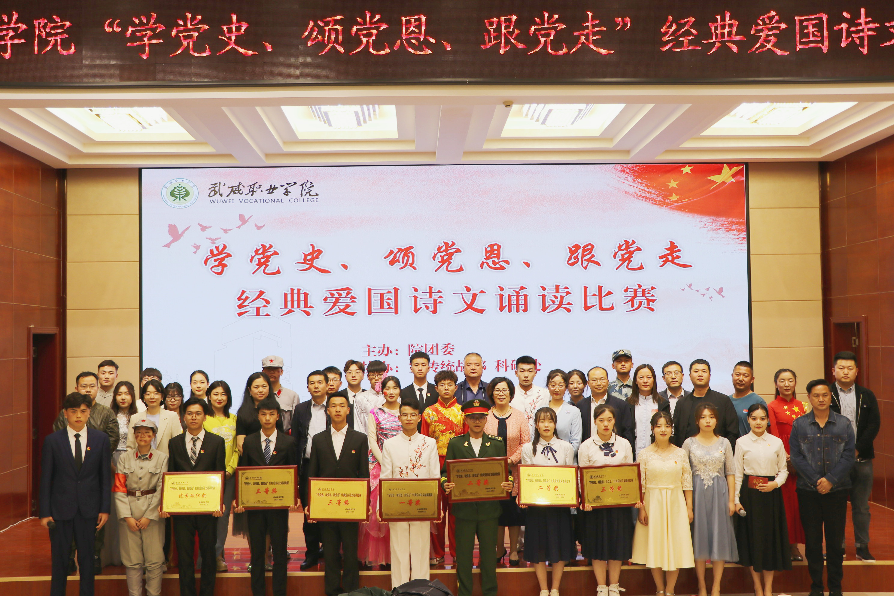 今年正值建黨100周年,為深化學(xué)黨史教育活動(dòng),鼓勵(lì)當(dāng)代大學(xué)生通過誦讀愛國(guó)詩文,頌揚(yáng)黨的光輝歷史,抒發(fā)愛黨愛國(guó)情懷,更加堅(jiān)定理想信念,堅(jiān)定跟黨初心。5月18日晚,學(xué)院團(tuán)委在菁英廳舉辦“學(xué)黨史、頌黨恩、跟黨走”經(jīng)典愛國(guó)詩文誦讀大賽決賽。黨委委員、副院長(zhǎng)王守云出席活動(dòng)并為獲獎(jiǎng)代表隊(duì)頒獎(jiǎng),200多名師生觀看了比賽。