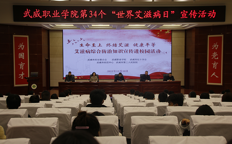 11月30日,學院在菁英廳開展了“生命至上 終結艾滋 健康平等”艾滋病綜合防治知識宣傳進校園活動。市疾控中心工會主席張富國、市婦聯副主席張惠華、學院黨委委員、副院長王守云,市第二人民醫(yī)院院長滕亮出席活動,活動由學院護理系黨總支書記張建輝主持,市紅十字會、市疾控中心、天馬行市民云數據有限公司工作人員及武威職業(yè)學院師生代表參加活動。