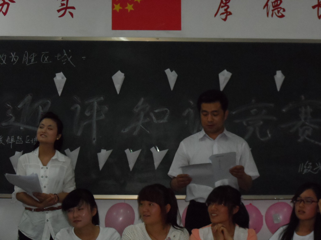 比賽開始前顏老師對(duì)本次評(píng)估工作向同學(xué)們提出了要求,同時(shí)表示了對(duì)此次競(jìng)賽的充分肯定。比賽以“校園評(píng)估知識(shí)”為主題,共分為五個(gè)環(huán)節(jié)。當(dāng)主持人宣布第一環(huán)節(jié)“必答題”的比賽開始后,場(chǎng)上緊張激烈的較量便從未停止過(guò),各位選手更是思維敏捷,回答嚴(yán)絲合縫。第二環(huán)節(jié)“是非題”各參賽隊(duì)緊追不舍,陣陣掌聲過(guò)后,迎來(lái)了第三環(huán)節(jié)“搶答題”的比賽,選手們以平時(shí)積累的大量知識(shí)和默契的配合征服了在場(chǎng)的所有人。在后兩個(gè)環(huán)節(jié)“風(fēng)險(xiǎn)題”,和“選答題”中,有趣的知識(shí),嚴(yán)密的思維被同學(xué)們展現(xiàn)的淋漓盡致,陣陣掌聲在教室經(jīng)久不息。