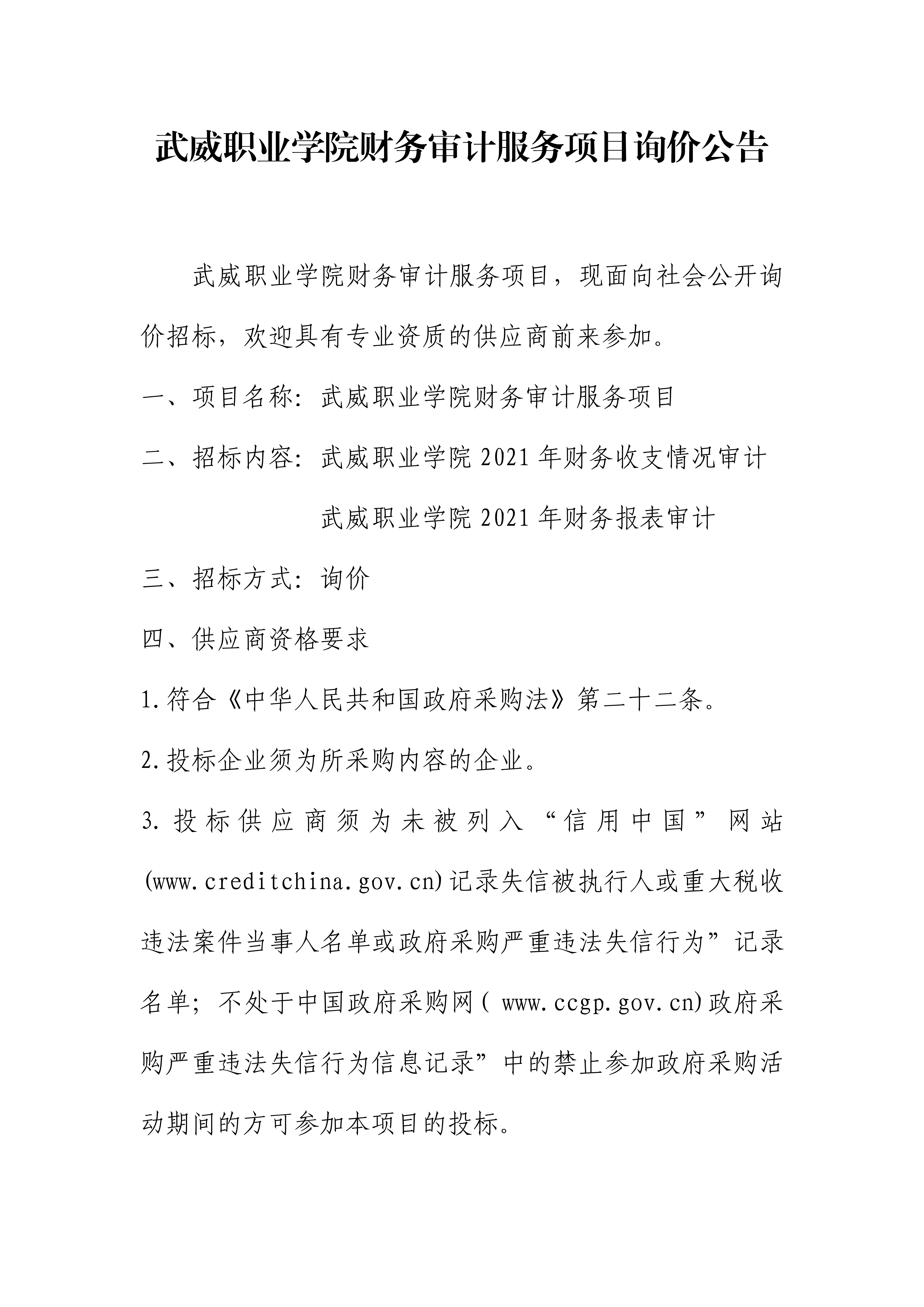 武威職業(yè)學(xué)院財務(wù)審計服務(wù)項目詢價公告