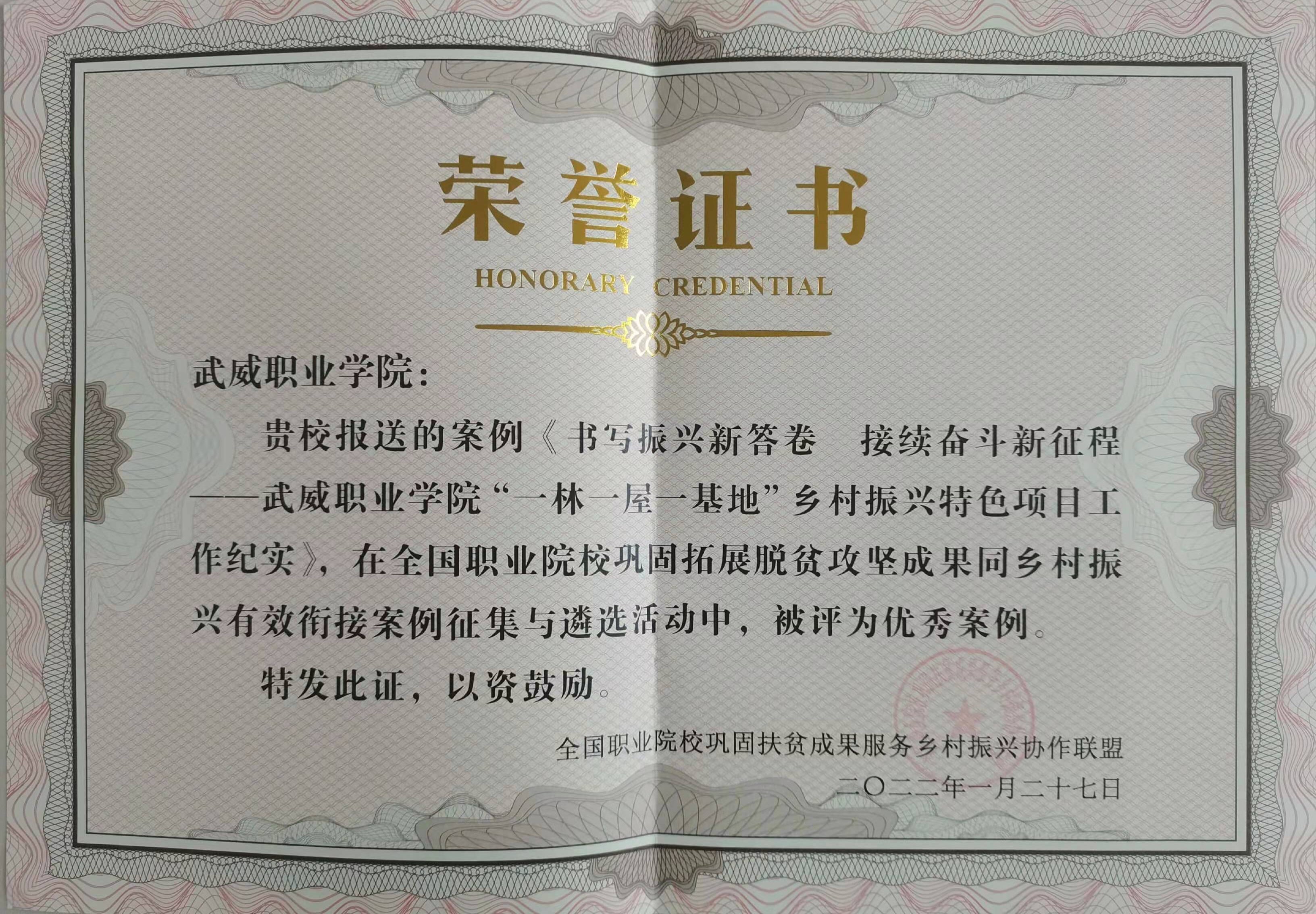 近日,學(xué)院鄉(xiāng)村振興成果《書寫振興新答卷 接續(xù)奮斗新征程——武威職業(yè)學(xué)院“一林一屋一基地”鄉(xiāng)村振興特色項目工作紀(jì)實》被全國職業(yè)院校鞏固扶貧成果服務(wù)鄉(xiāng)村振興協(xié)作聯(lián)盟評為優(yōu)秀案例。