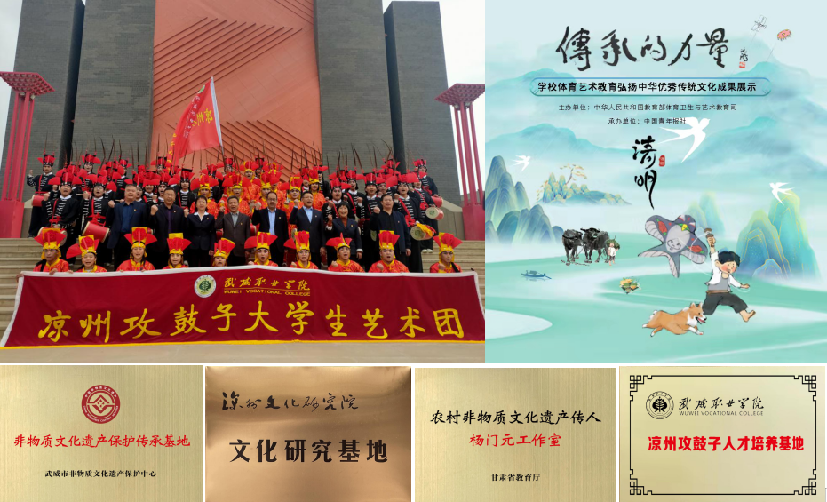 近年來,學(xué)校全力推進(jìn)“雙高計劃”項目建設(shè),組織成立了武威職業(yè)學(xué)院涼州攻鼓子大學(xué)生藝術(shù)團(tuán),聘請國家級非遺代表性傳承人楊門元親傳技藝,并開展了系列展演活動,著力打造特色校園文化品牌,助推文化繁榮、社會文明的新武威和華夏文明傳承創(chuàng)新區(qū)建設(shè),服務(wù)鄉(xiāng)村振興戰(zhàn)略。