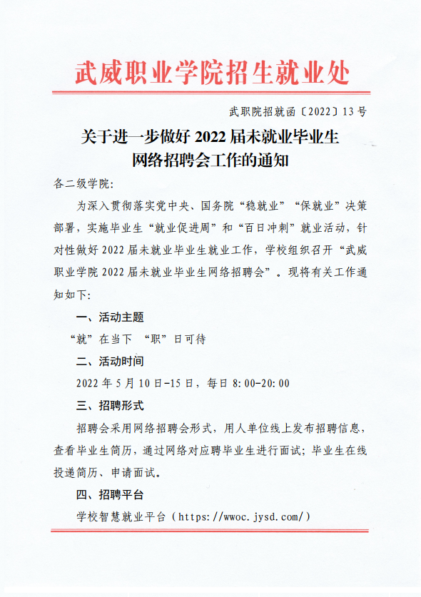 武威職業(yè)學(xué)院2022屆未就業(yè)畢業(yè)生就業(yè)促進周暨網(wǎng)絡(luò)招聘會邀請函