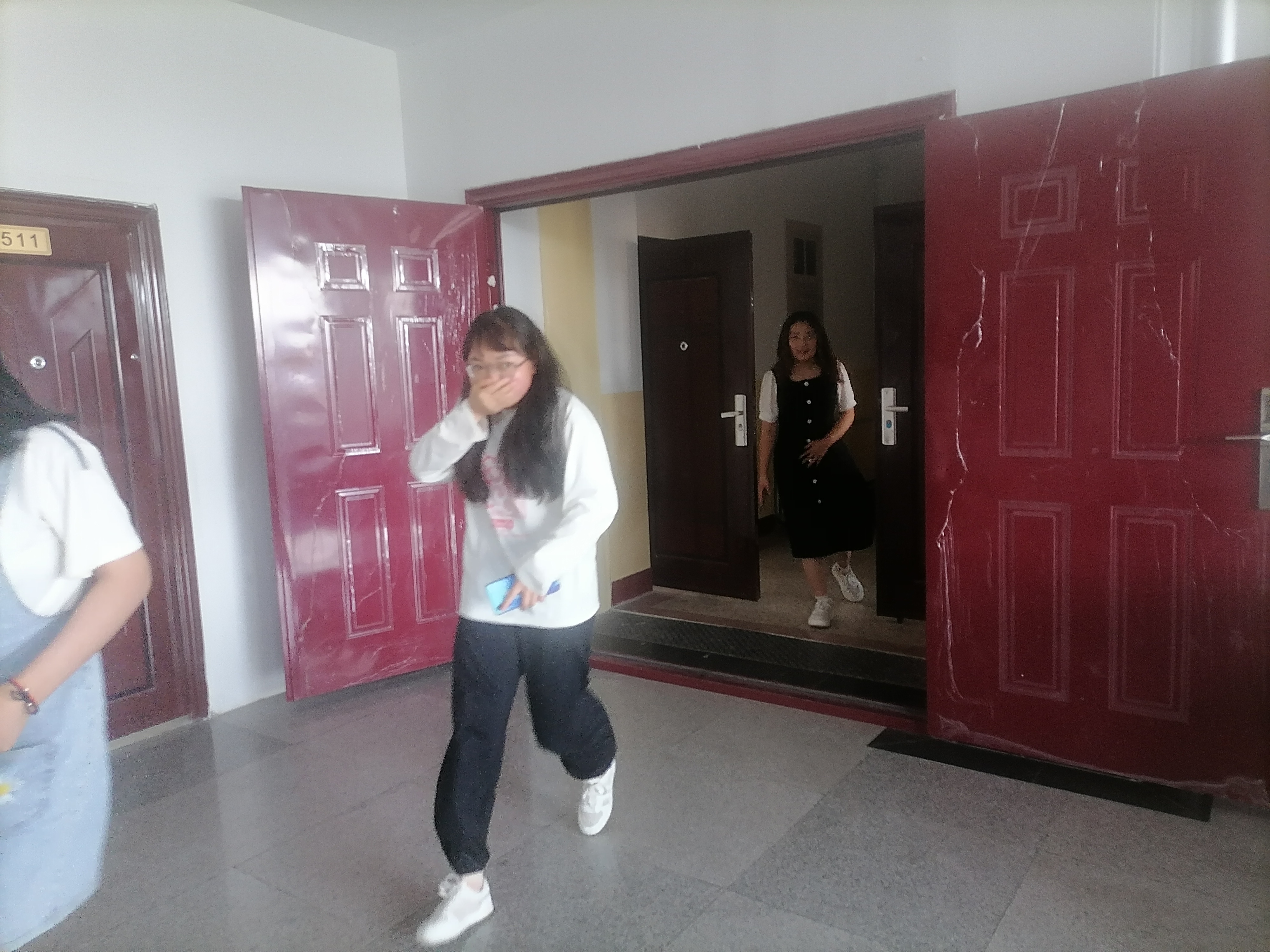 ? ?下午16:50隨著警報(bào)的響起,煙霧彈的點(diǎn)燃,上課老師組織學(xué)生疏散,各班學(xué)生在老師們的指揮下,按照指定路線,貓著腰,用手、袖口捂著嘴鼻迅速有序地進(jìn)行緊急疏散,全體師生撤離到安全地帶。為保證所有同學(xué)安全撤離,學(xué)生會成員迅速清點(diǎn)了各班級人數(shù),并像楊老師匯報(bào)。