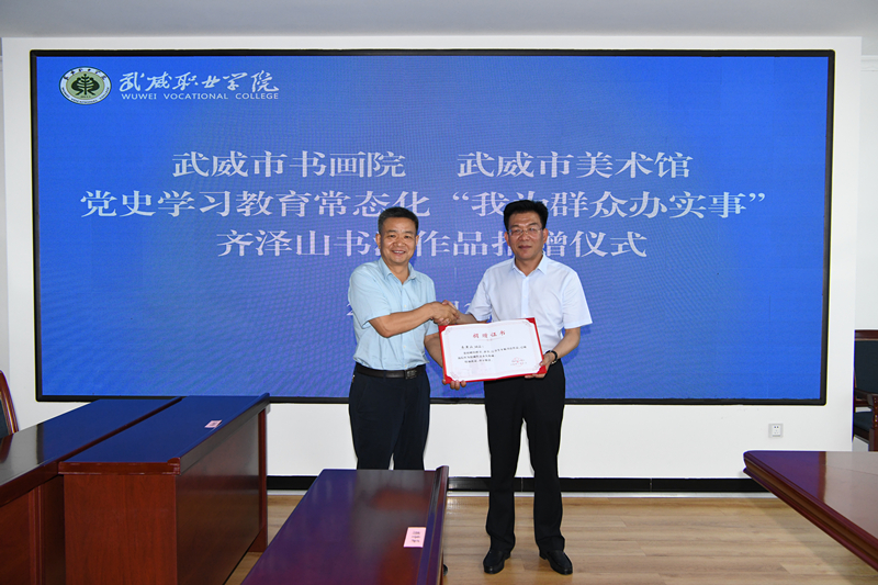 黨委書記、校長趙明向市書畫院(美術館)院長齊澤山頒發(fā)了捐贈證書,武威市書畫院(武威美術館)院長齊澤山將精心創(chuàng)作了8幅大幅書法作品捐贈給學校。