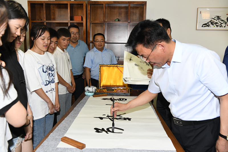 捐贈儀式前,齊澤山一行參觀了學校紅色文化藝術館、學生發(fā)展中心、雙創(chuàng)中心、藝術與教育學院書法實訓室等場地,并現(xiàn)場指導學校志通書法協(xié)會學生習作。