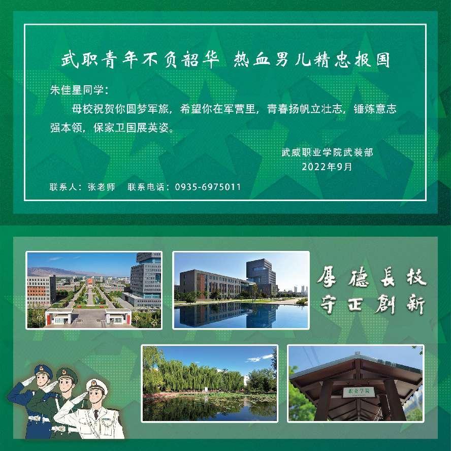 金鑫代表涼州區(qū)人武部和兵役機(jī)關(guān),感謝武威職業(yè)學(xué)院多年來(lái)一直對(duì)征兵工作的大力支持,感謝學(xué)校為部隊(duì)輸送優(yōu)秀青年,并要求入伍大學(xué)生,嚴(yán)格訓(xùn)練,做好從學(xué)生到戰(zhàn)士的迅速轉(zhuǎn)變,早日成為一名合格的人民子弟兵。