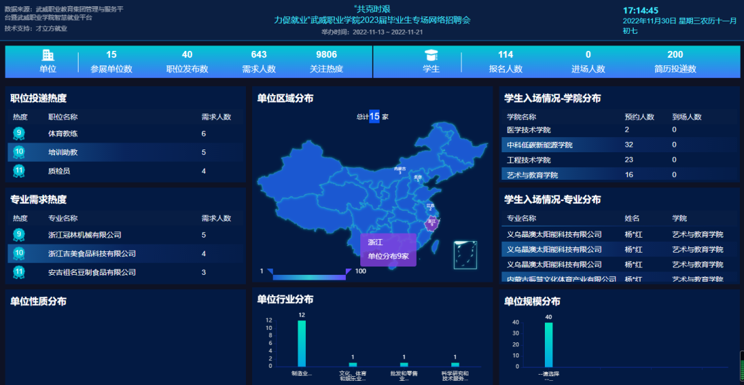 第二階段為武威職業(yè)學(xué)院2023屆畢業(yè)生校園網(wǎng)絡(luò)招聘會。活動已于2022年11月22日啟動,截至目前已吸引45家用人單位參會,提供就業(yè)崗位113個,需求人數(shù)3460人,招聘會關(guān)注人次達38095,投遞簡歷人數(shù)達903人次。