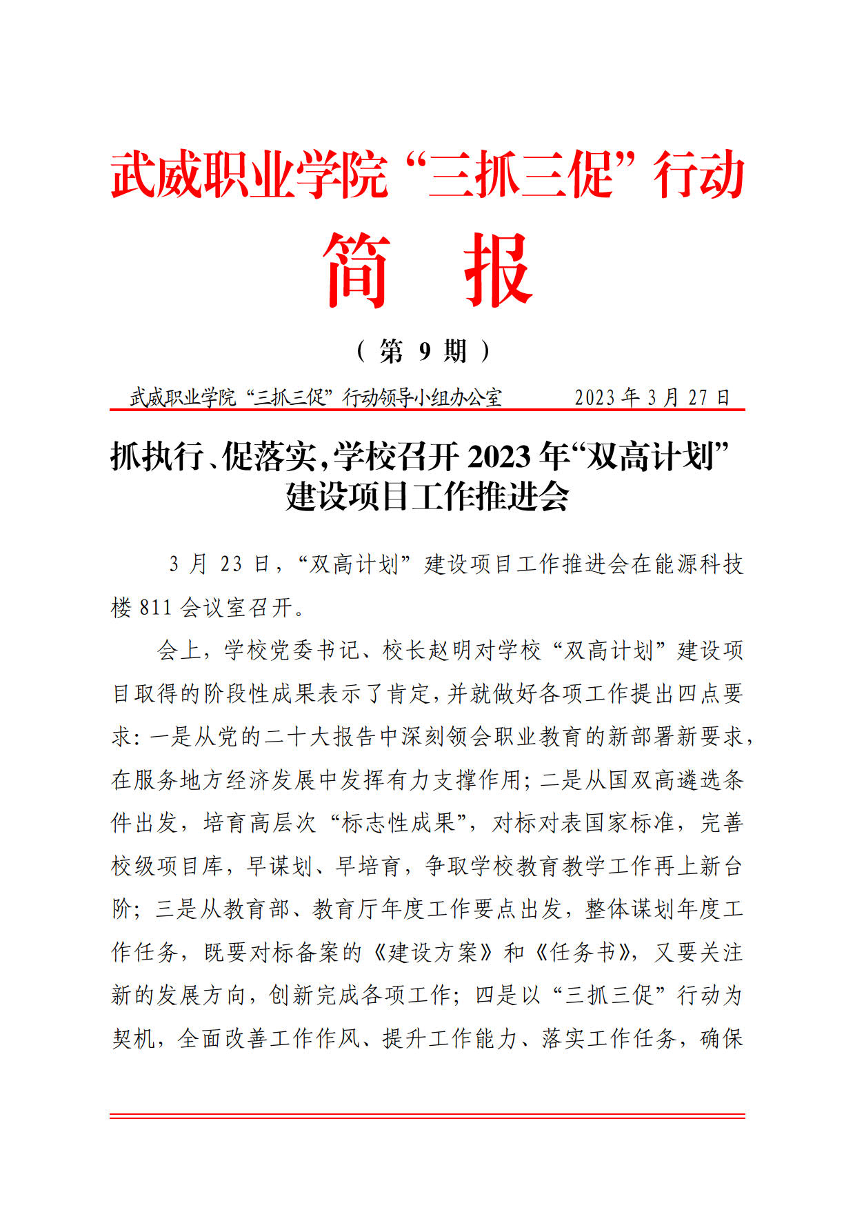 簡報(bào)第9期:抓執(zhí)行、促落實(shí),學(xué)校召開2023年“雙高計(jì)劃”建設(shè)項(xiàng)目工作推進(jìn)會(huì)