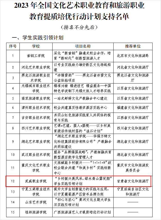 6月8日,文化和旅游部公布2023年全國(guó)文化藝術(shù)職業(yè)教育和旅游職業(yè)教育提質(zhì)培優(yōu)行動(dòng)計(jì)劃入選名單,我校申報(bào)的學(xué)生實(shí)踐引領(lǐng)計(jì)劃項(xiàng)目成功入選,是甘肅省唯一入選項(xiàng)目,全國(guó)僅15家單位入選。