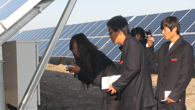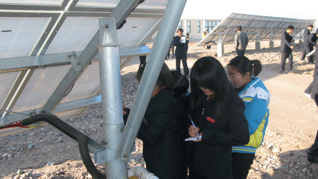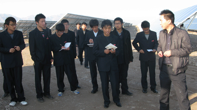 在觀摩學(xué)習(xí)過程中,全體師生受到了園區(qū)管委會工作人員的熱情接待,管委會張國偉主任帶領(lǐng)師生參觀了中節(jié)能甘肅武威太陽能發(fā)電有限公司,公司負(fù)責(zé)人向大家介紹了園區(qū)建設(shè)情況,從多晶硅、單晶硅的提煉、太陽能電池板的生產(chǎn)制造到光伏電站的建設(shè),對光伏發(fā)電產(chǎn)業(yè)鏈進(jìn)行了較詳盡的講述。同學(xué)們看到園區(qū)內(nèi)一排排整齊擺置的太陽能電池板方陣時(shí),都流露出激動(dòng)崇敬的神情,一個(gè)個(gè)邊走邊看,并伸手觸摸太陽能電池板。同學(xué)們就光伏發(fā)電的原理、電池使用壽命、光電轉(zhuǎn)換效率以及光伏電站的運(yùn)行維護(hù)等方面的專業(yè)知識向負(fù)責(zé)人請教,面對大家的疑問,園區(qū)負(fù)責(zé)人都耐心細(xì)致的做了解答。