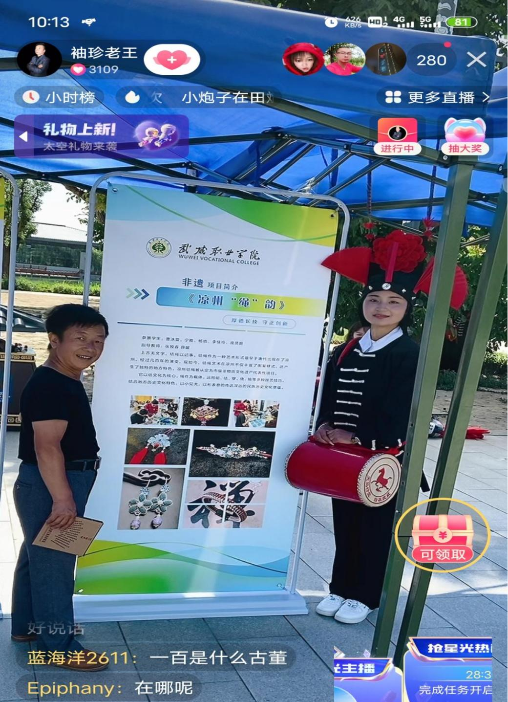 實(shí)踐團(tuán)在雷臺(tái)景區(qū)開(kāi)展了涼州攻鼓子的展演活動(dòng),團(tuán)員們身著黑夸衣,頭戴黑幞帽,在炎炎夏日里向過(guò)往游客展示攻鼓子的魅力,過(guò)往游客深感震撼。此外,實(shí)踐團(tuán)成員通過(guò)文化展架以及文創(chuàng)產(chǎn)品的形式展示武威非遺文化,并邀請(qǐng)網(wǎng)絡(luò)達(dá)人以現(xiàn)場(chǎng)直播的形式擴(kuò)大宣傳范圍,以新媒體的形式讓更多的人關(guān)注武威非遺文化。通過(guò)現(xiàn)場(chǎng)展演以及新媒體宣傳,創(chuàng)新“活”的交流模式,在弦歌不輟、思接千載的傳承中,非遺文化的芬芳愈加醇厚。