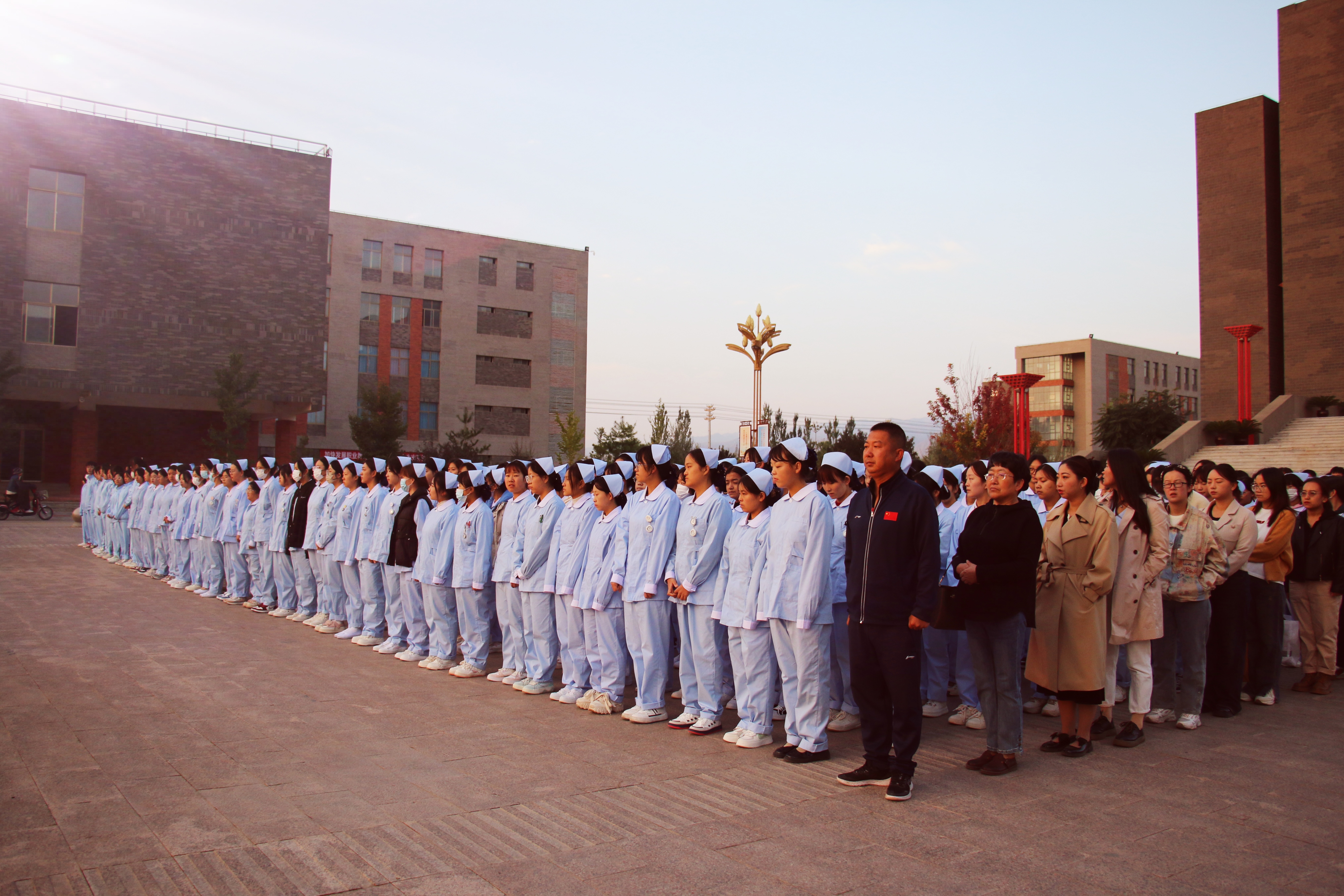 10月9日清晨,護(hù)理學(xué)院在圖書館前廣場(chǎng)舉行升國旗儀式,學(xué)院黨總支書記張建輝、團(tuán)委書記楊杰、全體班主任及2022、2023級(jí)全體學(xué)生參加此次升旗儀式,儀式由楊杰主持。