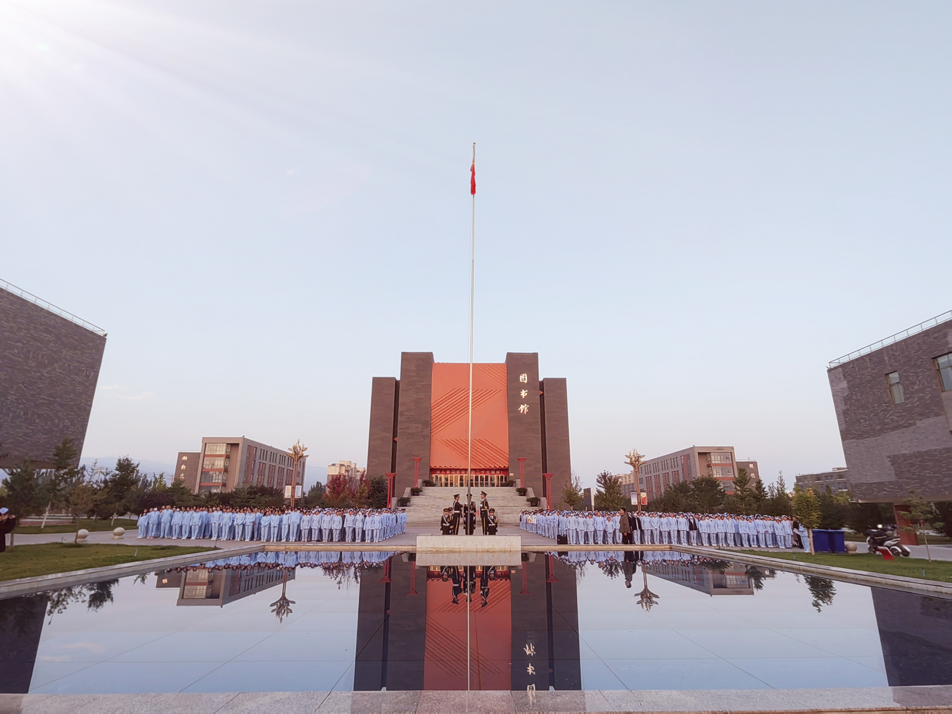 國旗護(hù)衛(wèi)隊(duì)昂首挺胸,邁著鏗鏘有力的步伐護(hù)送國旗緩緩走向旗臺(tái),全體師生肅然而立,行注目禮,伴隨著莊嚴(yán)的《中華人民共和國國歌》,五星紅旗在慷慨激昂的國歌聲中冉冉升起。