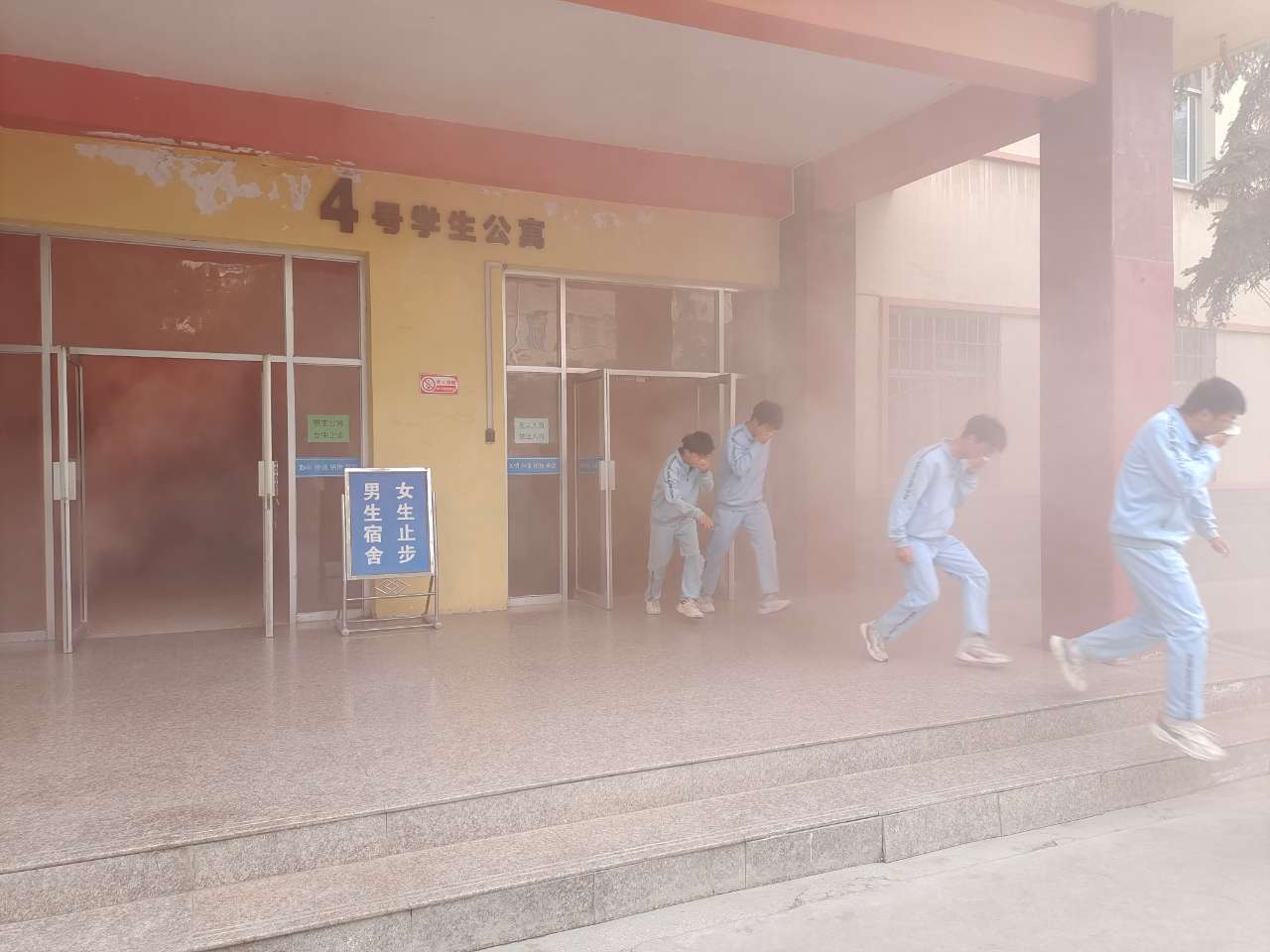 14時40分,疏散演練正式開始。隨著火災(zāi)警報響起,各學生公寓樓冒出滾滾濃煙,公寓管理人員迅速組織學生有序疏散。在軍訓教官、學生管理人員的引導下,同學們按照動作要領(lǐng),用濕毛巾捂住口鼻,俯身彎腰按照安全出口指示牌指引快速、有序從疏散通道撤離到體育場,整個過程緊張有序、實用性強,收到了預期效果。