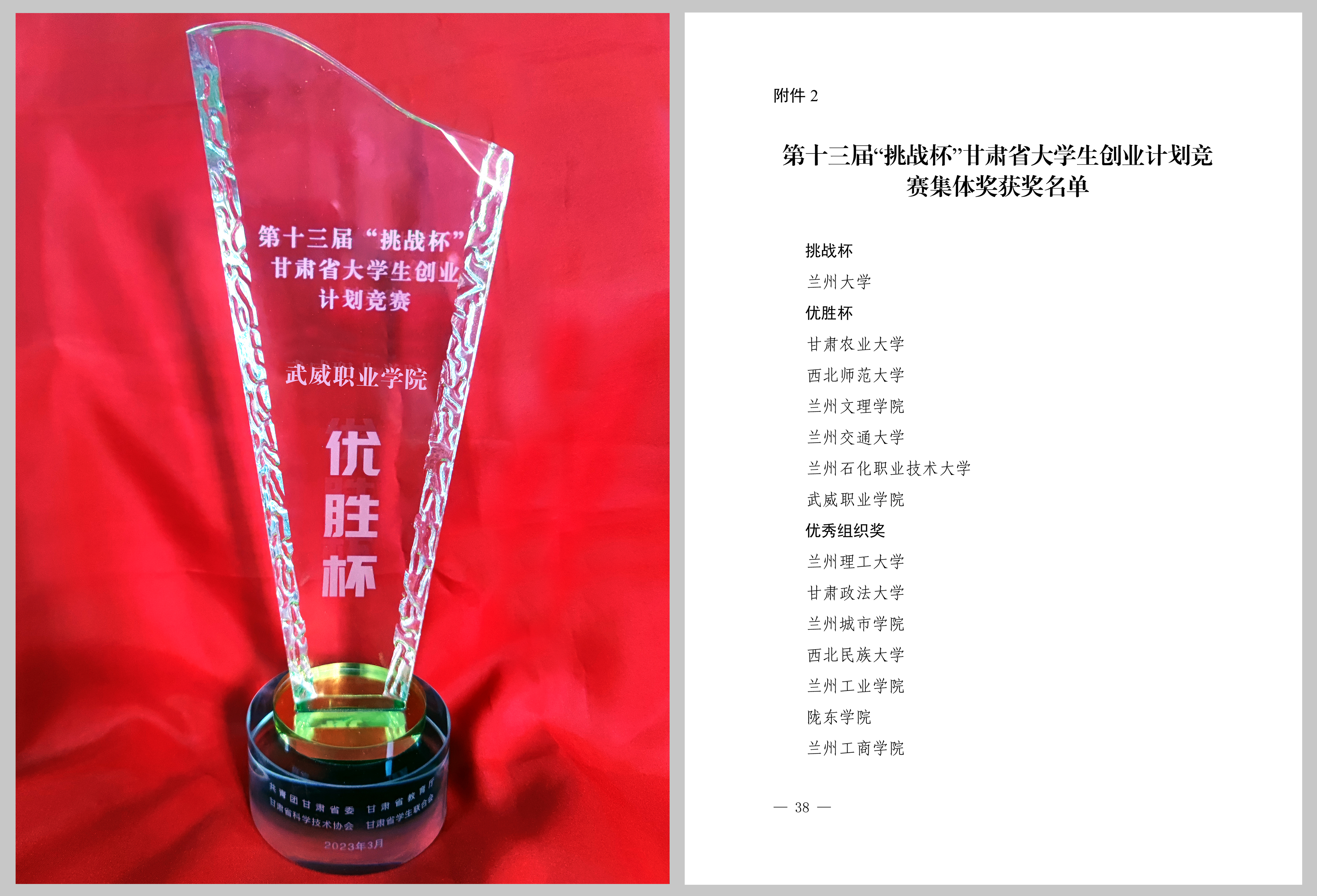 第十三屆“挑戰(zhàn)杯”甘肅省大學(xué)生創(chuàng)業(yè)計(jì)劃競(jìng)賽于2022年5月啟動(dòng),全省48所學(xué)校共有3926件作品參賽,經(jīng)過(guò)初賽選拔,最終592件作品參加省賽決賽?!疤魬?zhàn)杯”競(jìng)賽的最高集體榮譽(yù)為“挑戰(zhàn)杯”,授予團(tuán)體成績(jī)排名第一的學(xué)校,“優(yōu)勝杯”授予團(tuán)體總分排名靠前的學(xué)校。