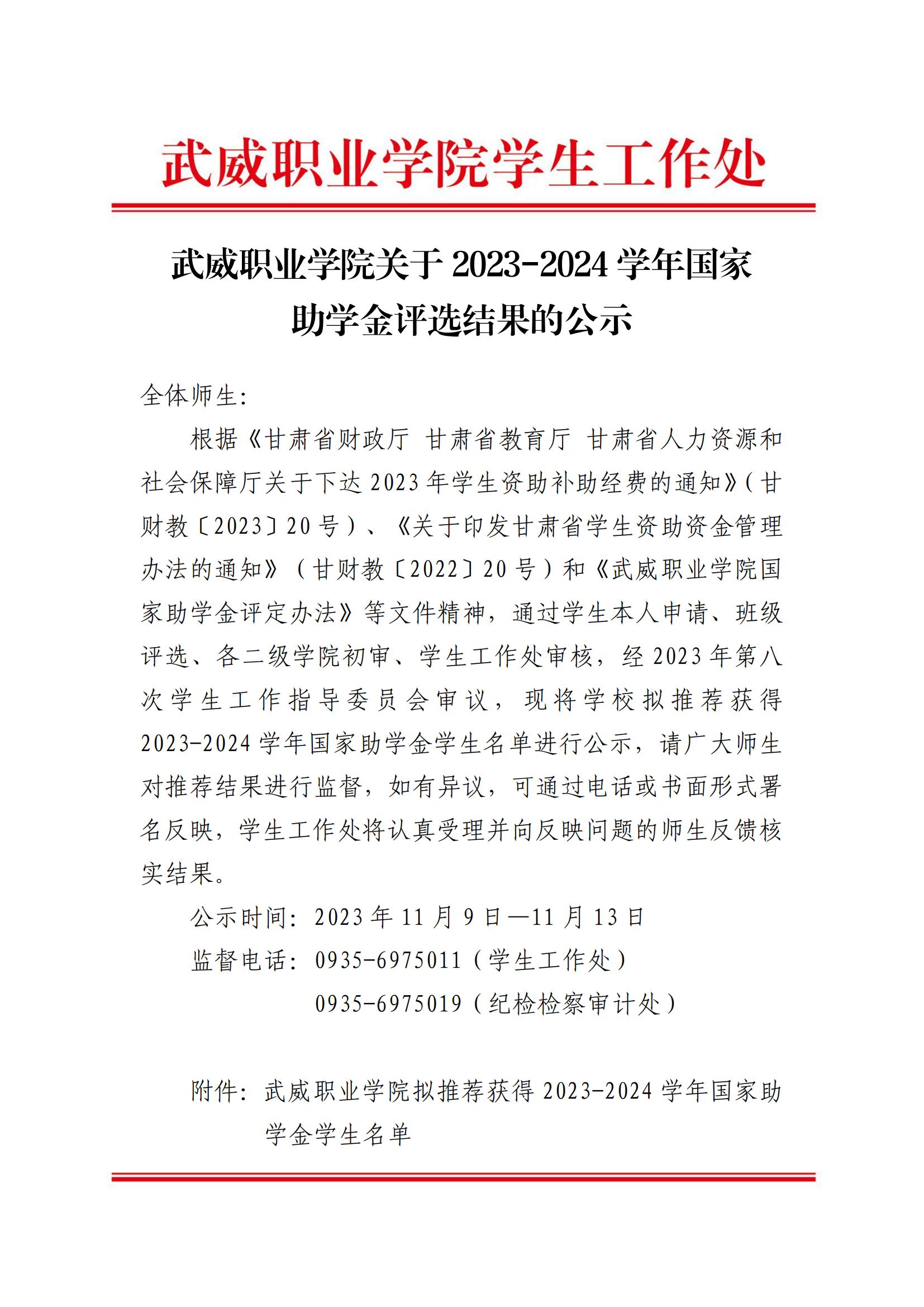 武威職業(yè)學(xué)院關(guān)于2023-2024學(xué)年國家助學(xué)金評選結(jié)果的公示