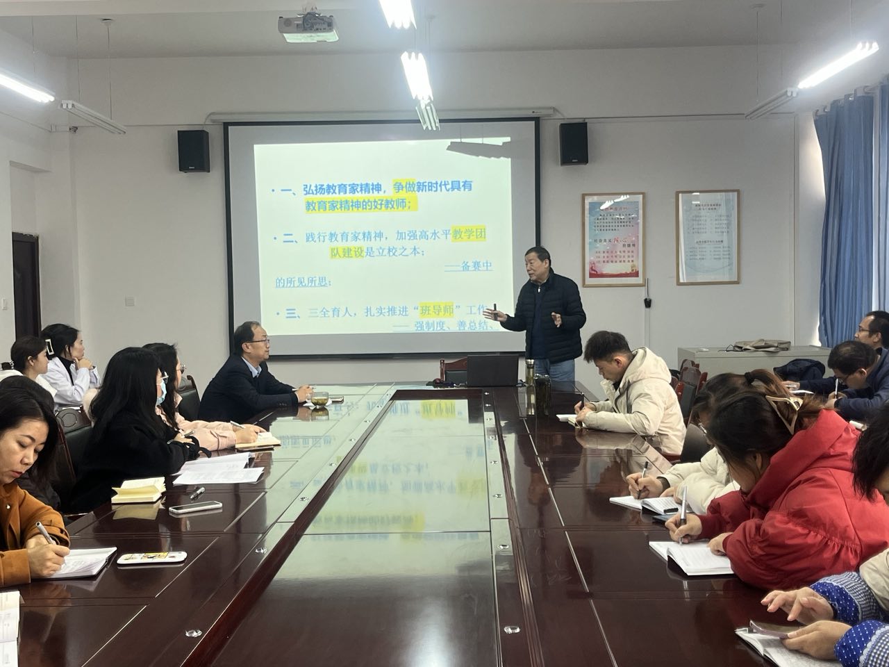 楊存忠教授主要從“弘揚教育家精神,爭做新時代具有教育家精神的好老師”、“踐行教育家精神,加強高水平教學(xué)團隊建設(shè)”、“三全育人,扎實推進班導(dǎo)師工作”以及“如何上好一堂課”四部分展開。楊存忠教授解讀了中國特有教育家精神的內(nèi)涵;闡述了堅持師德師風(fēng)第一標(biāo)準(zhǔn),大力弘揚教育家精神的重要意義和基本要求;結(jié)合典型案例,以案為戒,勉勵新時代教師既精通專業(yè)知識、做好“經(jīng)師”,又涵養(yǎng)德行、成為“人師”,努力做精于傳道授業(yè)解惑的“經(jīng)師”和“人師”的統(tǒng)一者。楊存忠教授還就如何上好一堂課與老師們進行了深入交流。