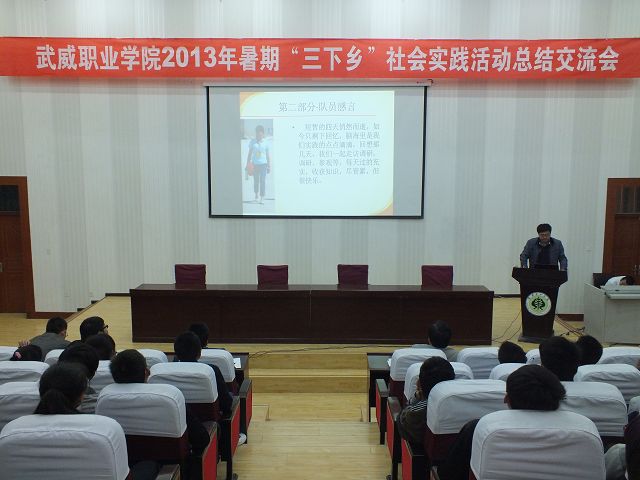 10月14日下午,武威職業(yè)學(xué)院2013年暑期“三下鄉(xiāng)”社會實(shí)踐活動(dòng)總結(jié)交流會在東階梯教室舉行,學(xué)院團(tuán)委負(fù)責(zé)人及各實(shí)踐團(tuán)隊(duì)成員和新生團(tuán)學(xué)干部代表共300人參加了交流會。